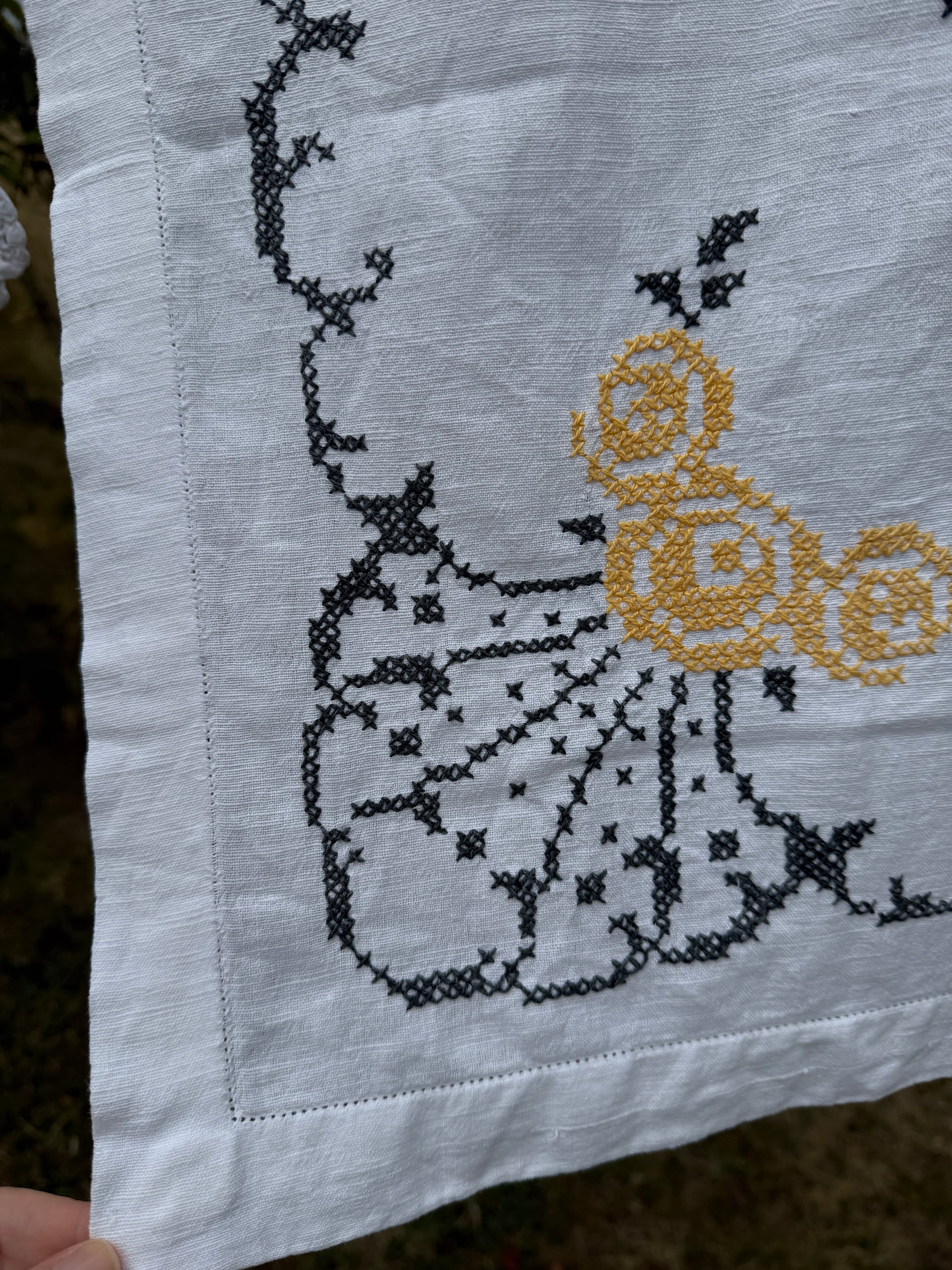 Pretty goldenrod and black cross stitched. No stains. 44"x22" Would make a cute vest or tote bag!
