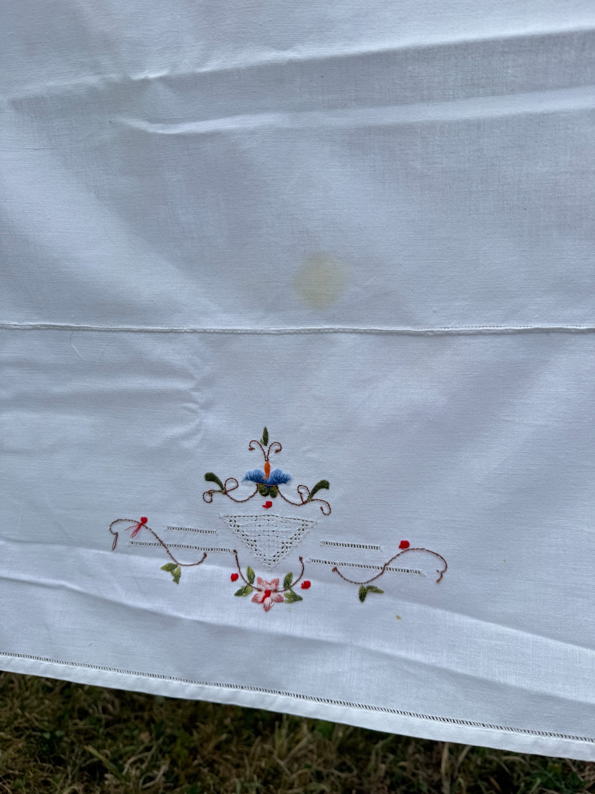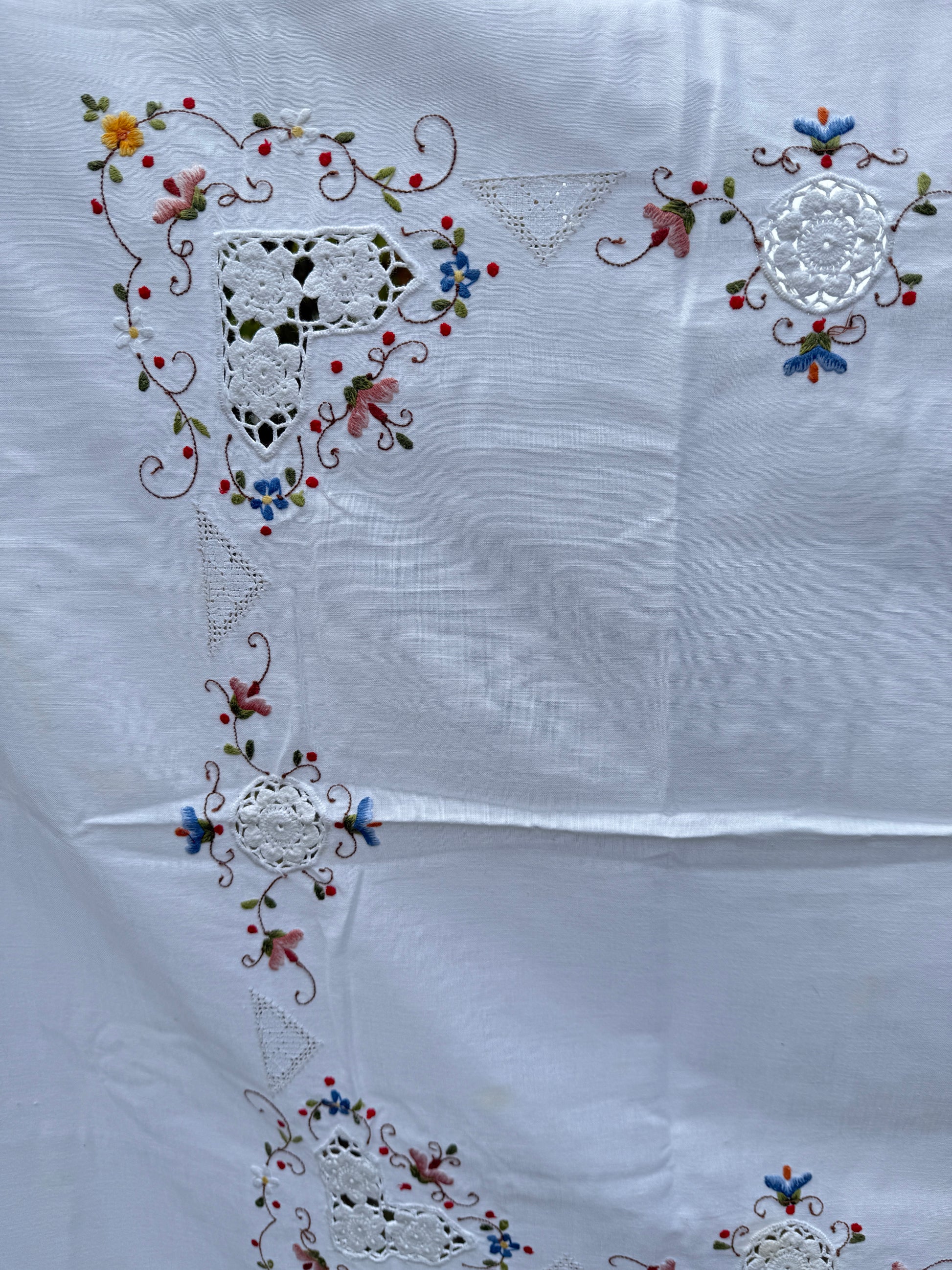 Colorful floral embroidery with crochet insets. 50" x 66" Has several coffee stains and a yellowed area where it was folded but because of it's size, there would be enough fabric to work around or you could soak out the stains.