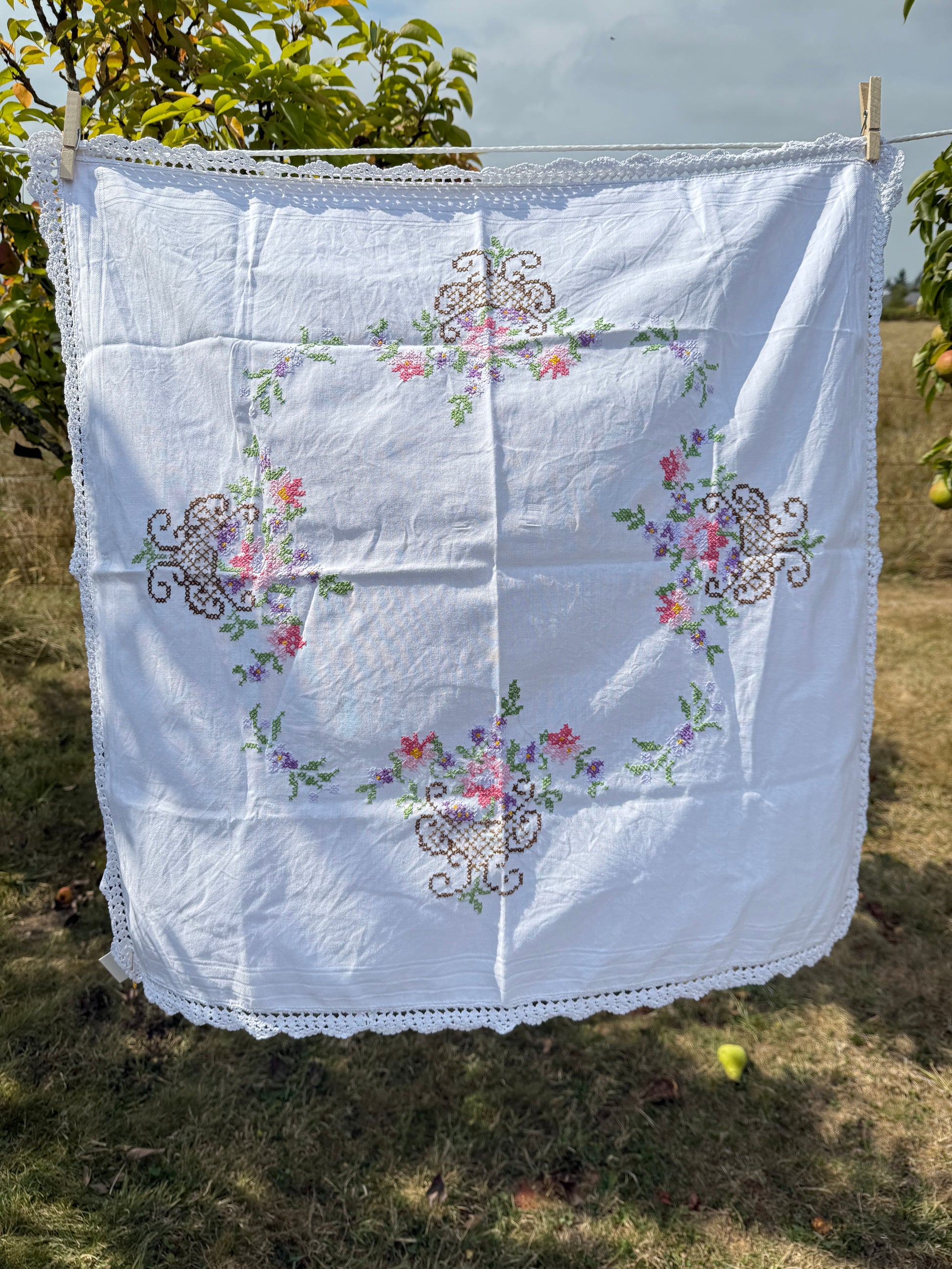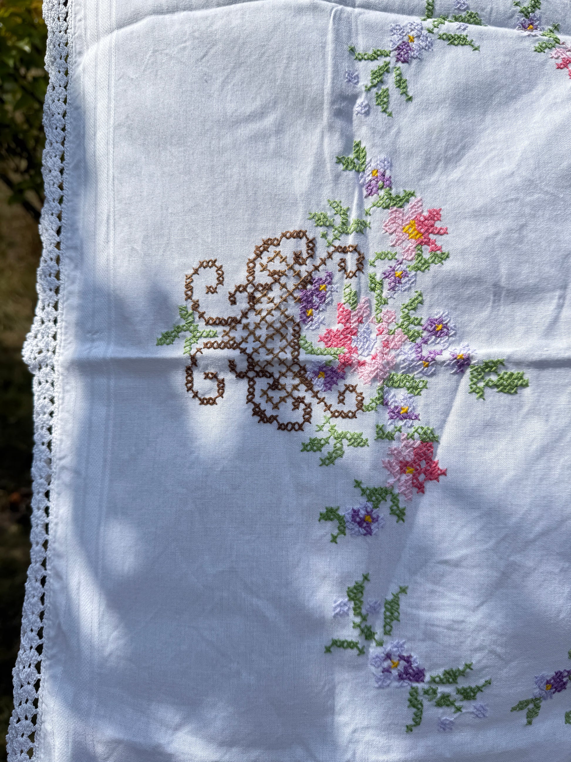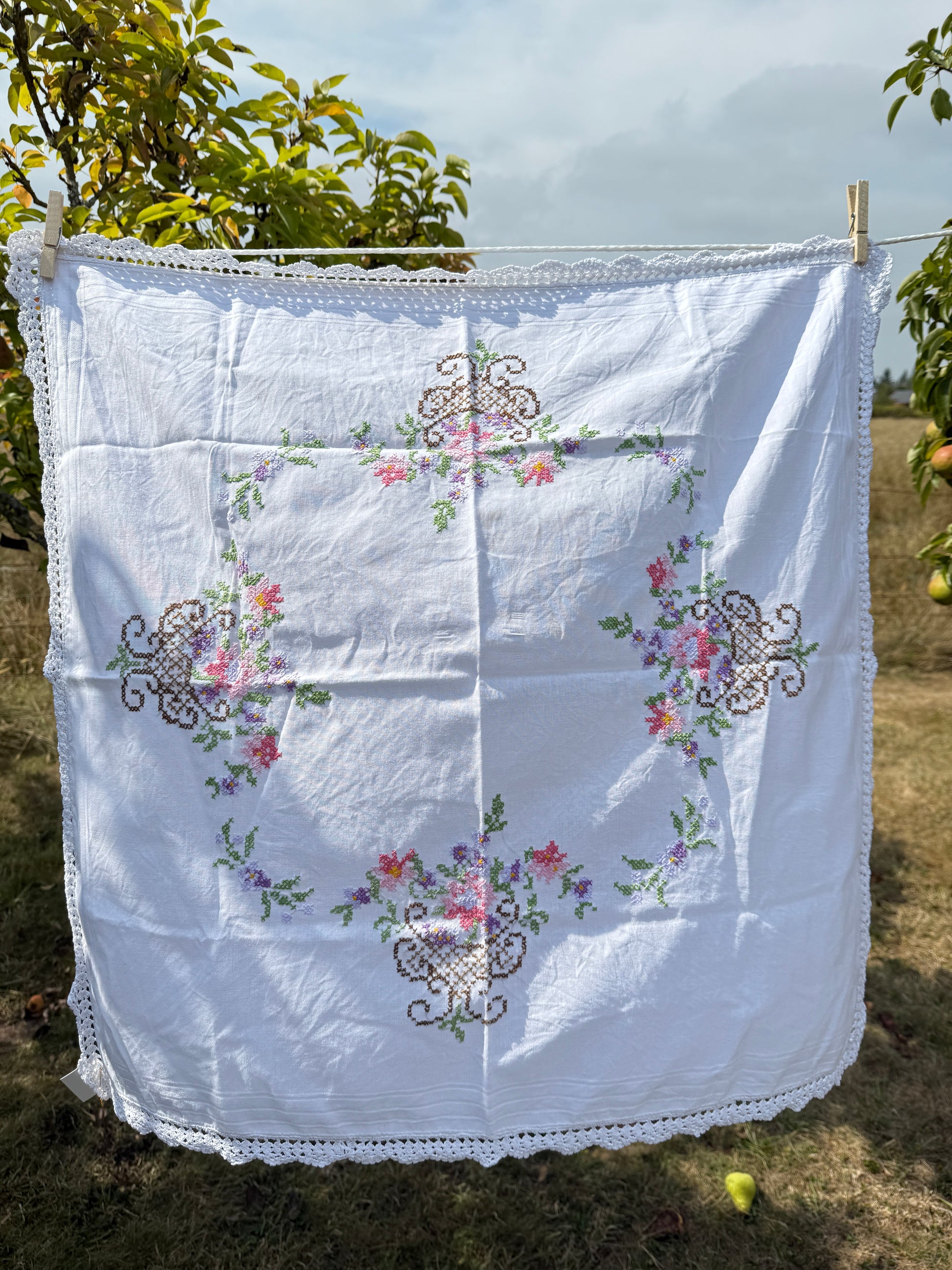 colorful flower basket with crochet trim 30" x 31". No stains.