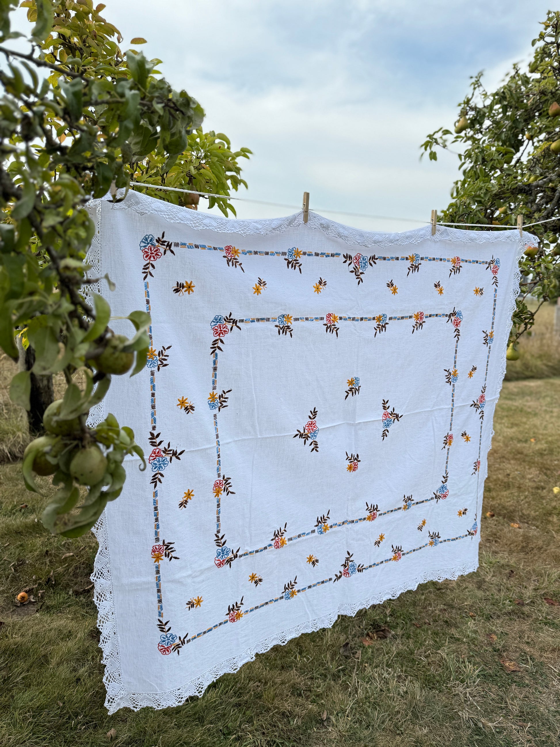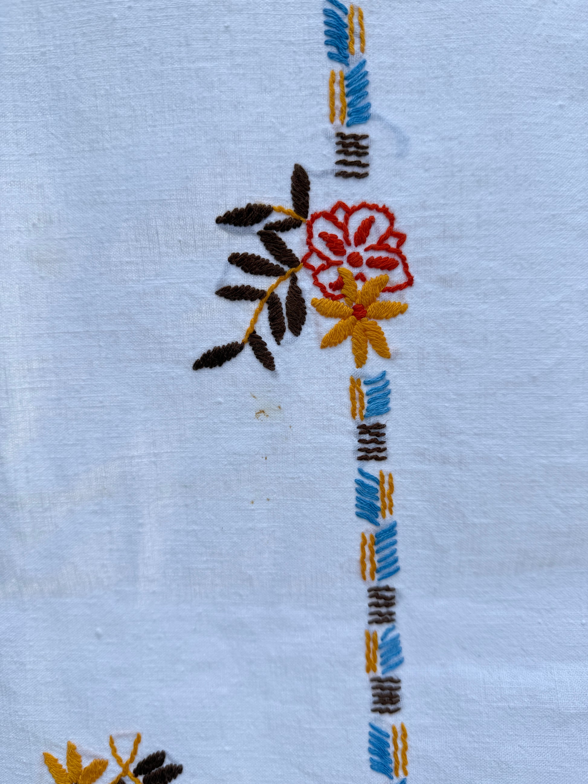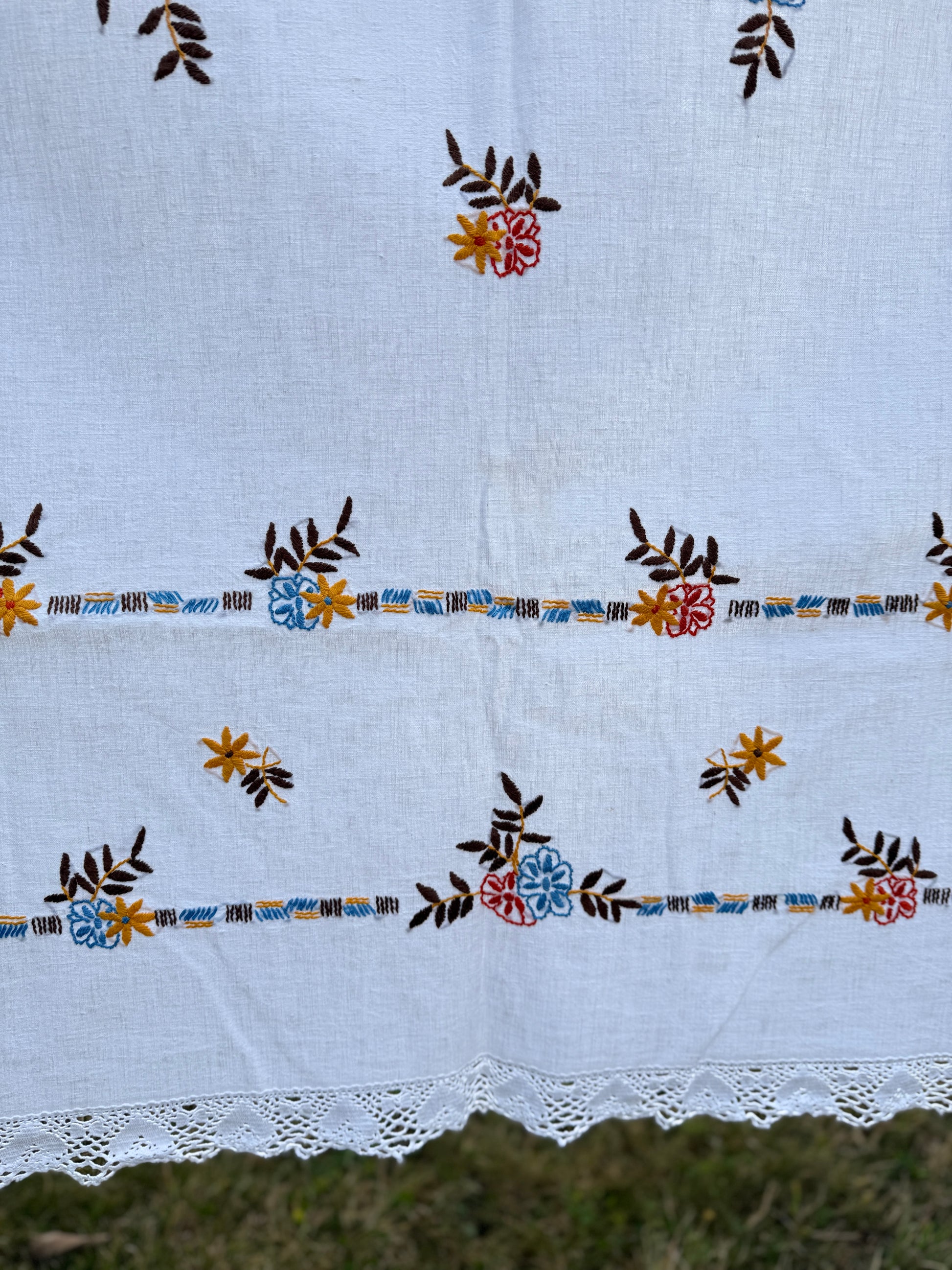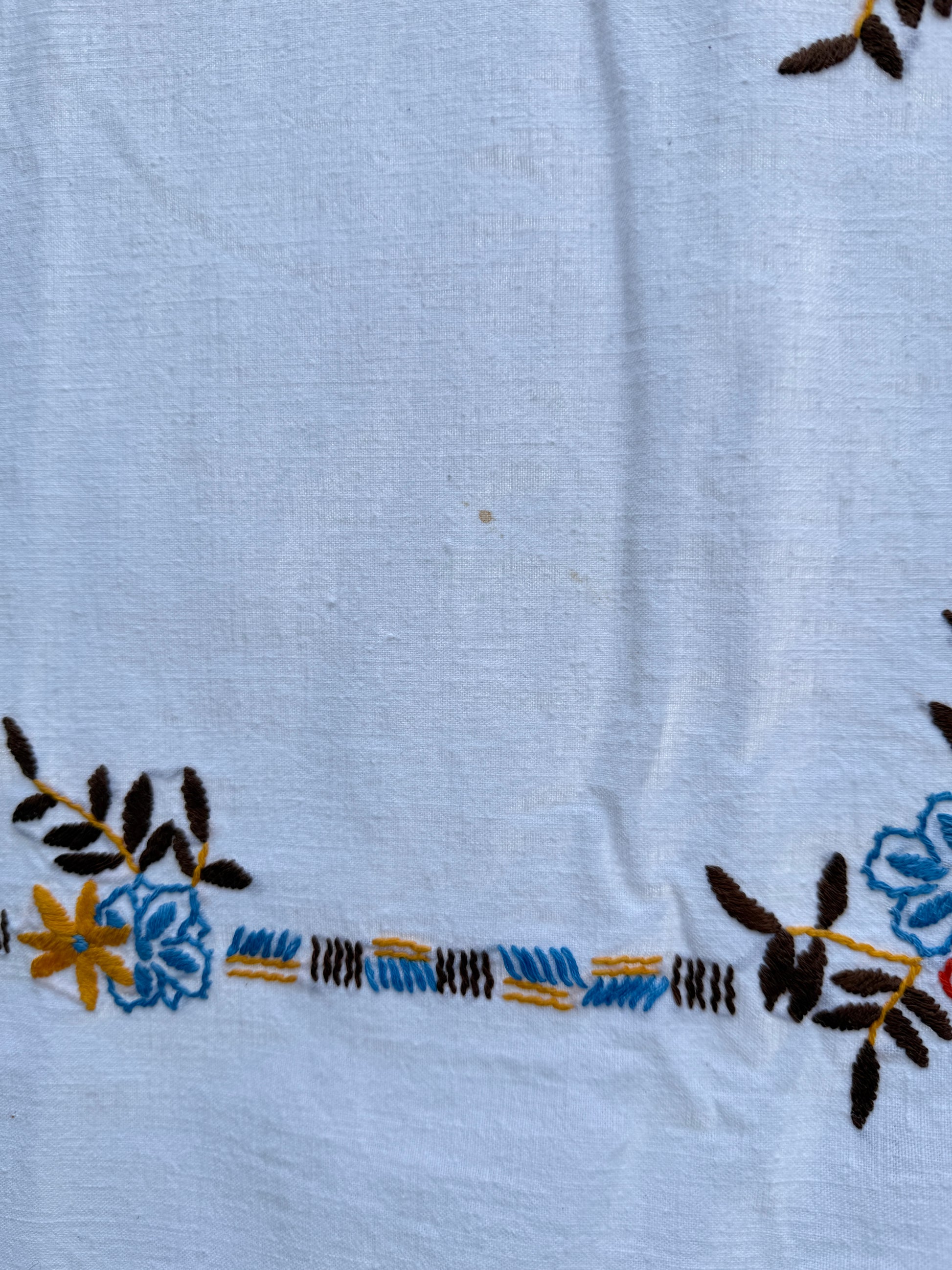 Pretty red, blue, orange flowers/brown stems with multi color borders on soft cotton canvas with crochet edging 60" x 51". Has 7 or 8 small stains and one very light coffee stain but because of its large size these could be worked around.