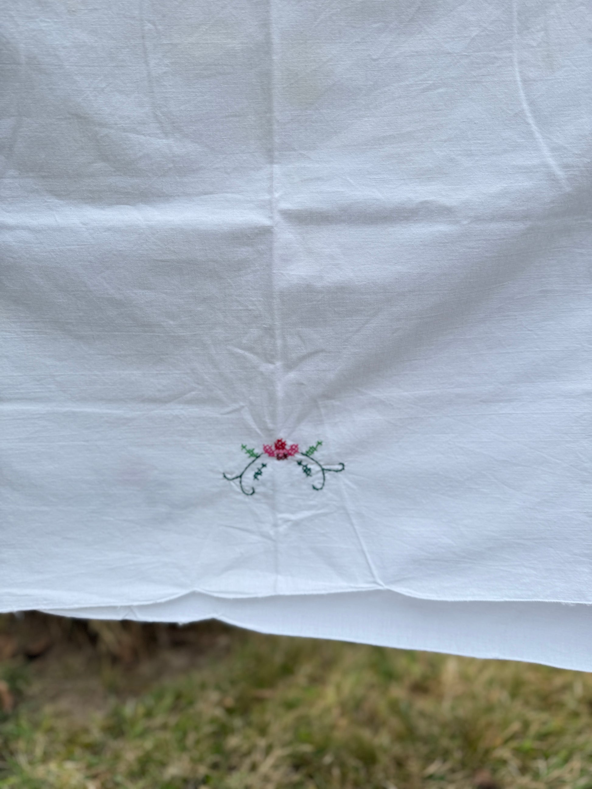 Colorful floral embroidery with crochet insets. 62" x 93" Has many coffee stains in the center but the 4 corners and edges are clean and would be perfect for a blouse.