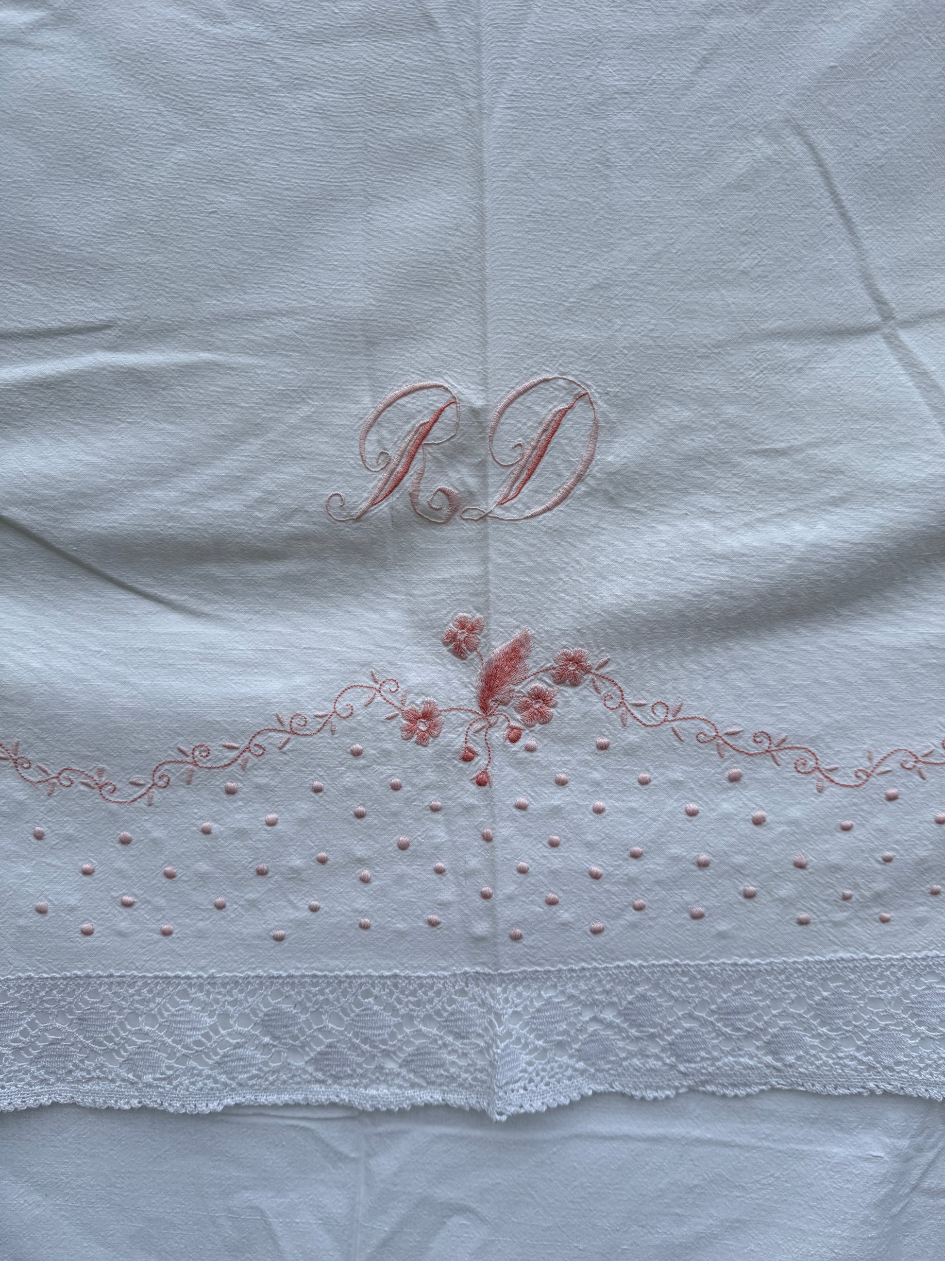 AA. Pink embroidered sheet with crochet trim 63" x 90"