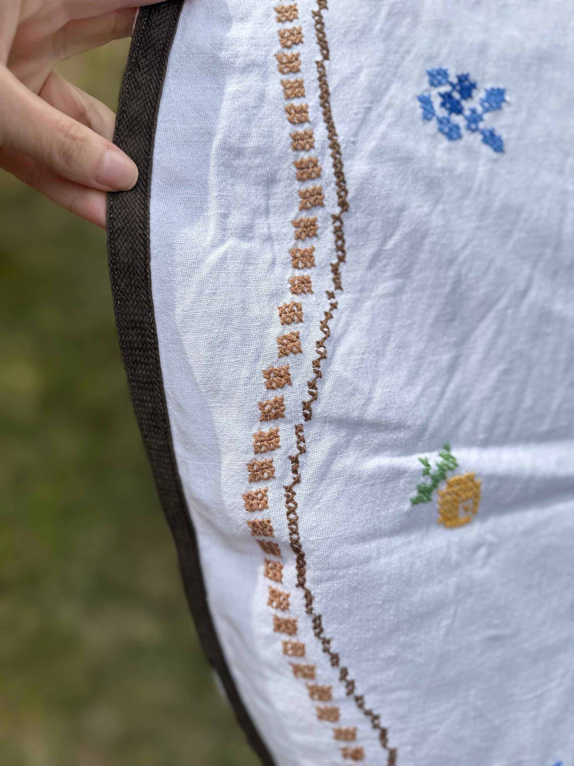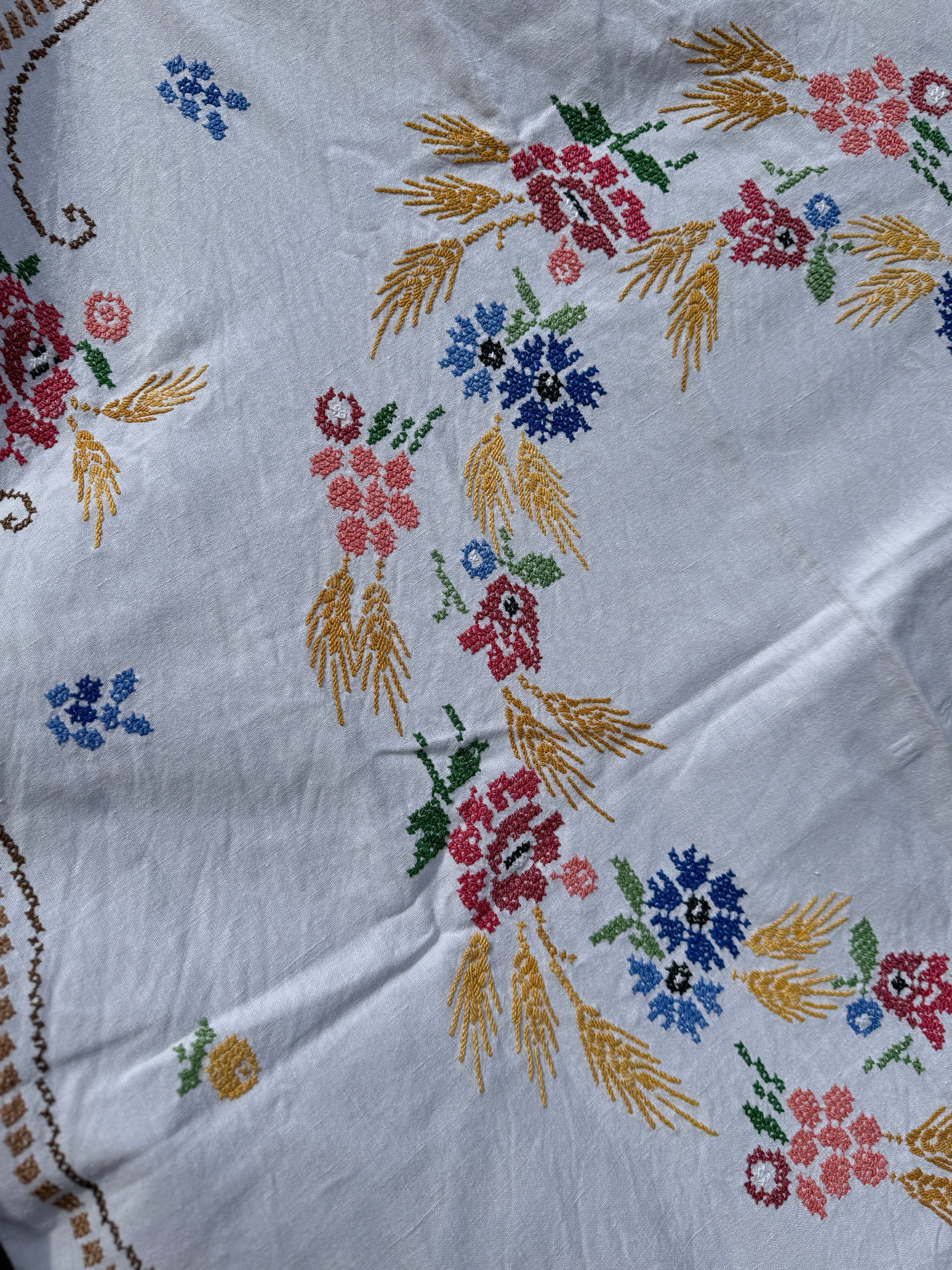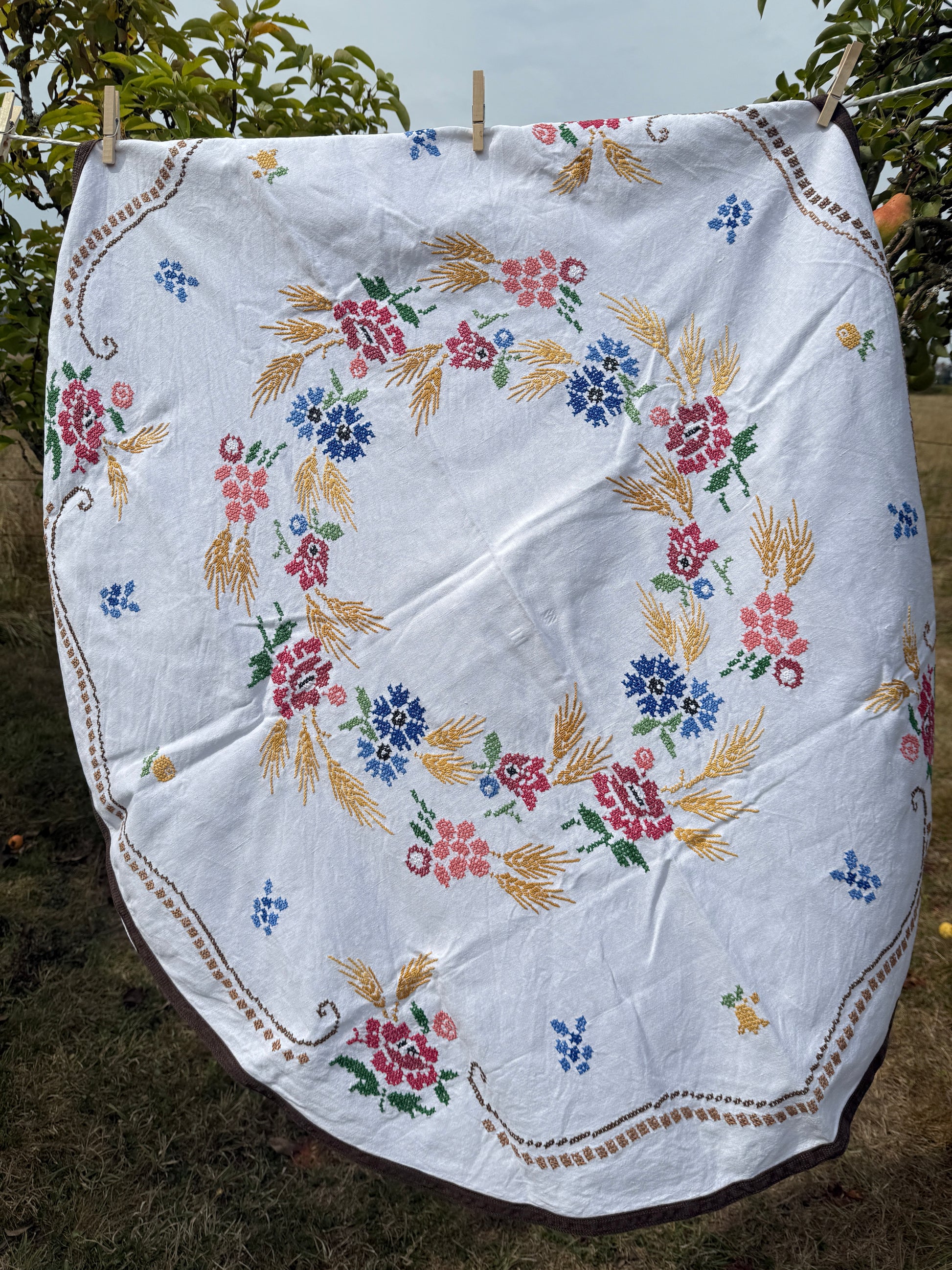 Harvest colored embroidery on canvas with brown bias trim on edges. 43" round. No stains.