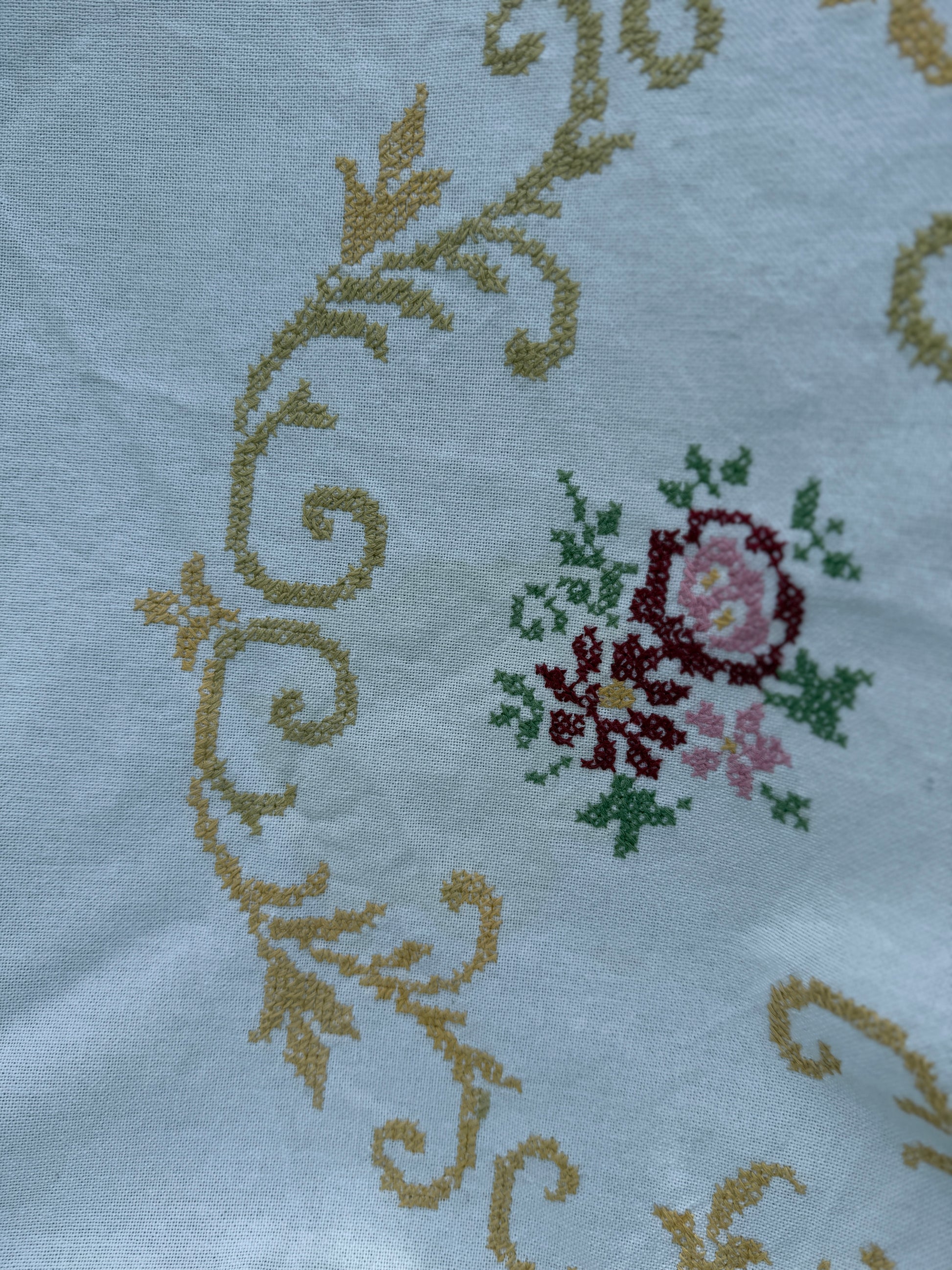 Pretty pink and goldenrod flowers and scrolls on heavy canvas with pretty edging, 60" round. Two coffee stains. Would make a cute tote bag!
