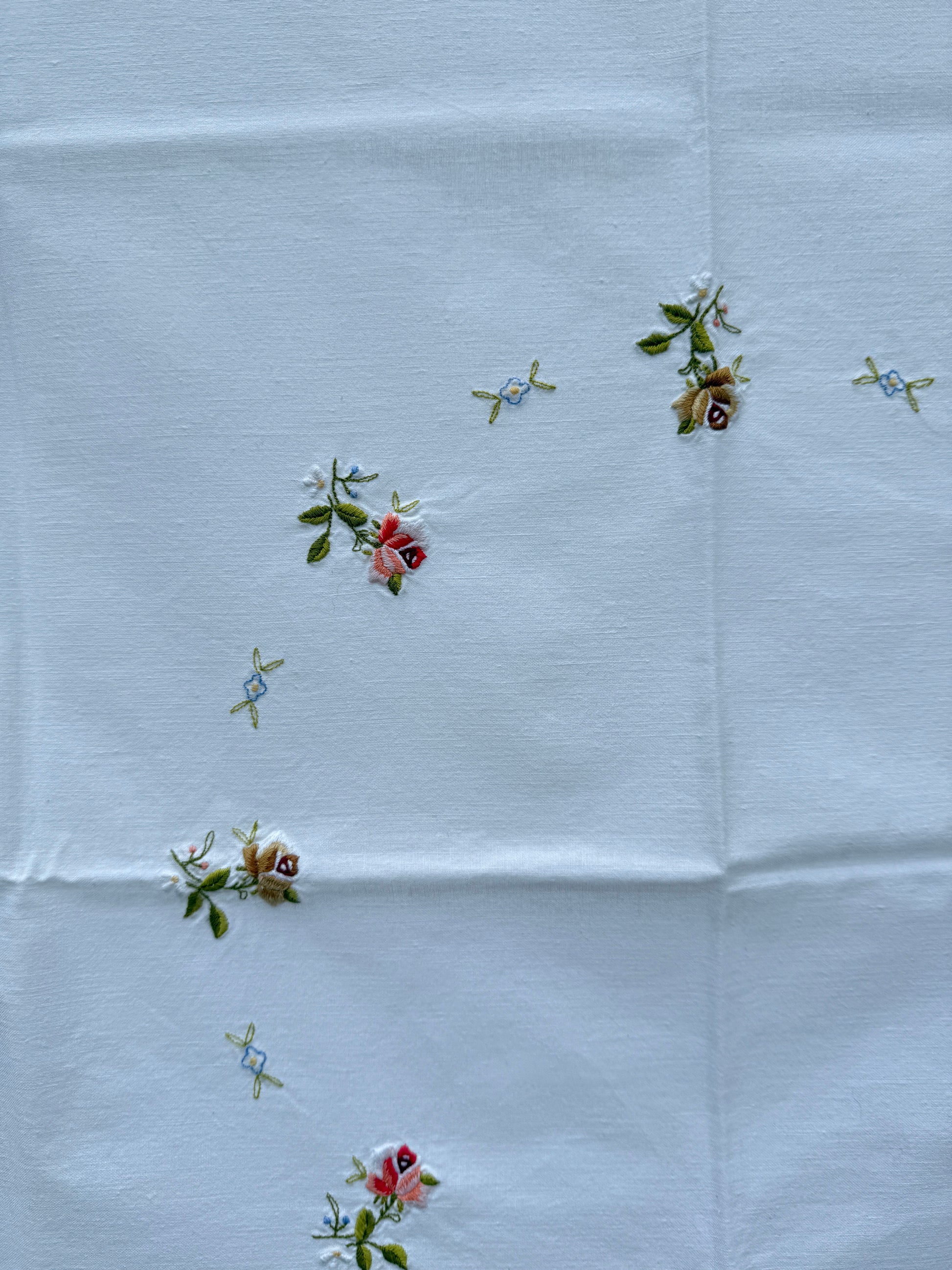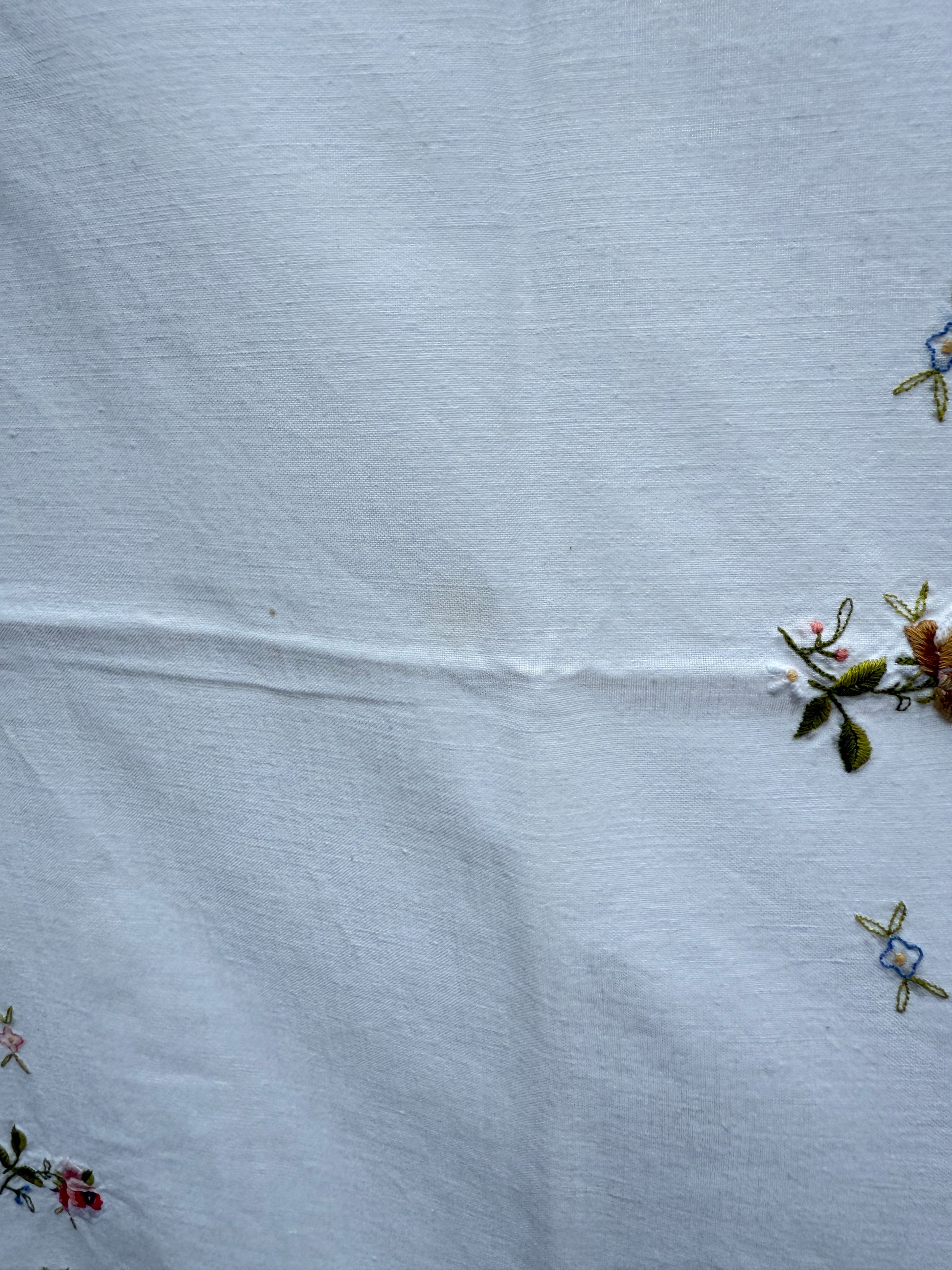 Pretty white cotton with rose embroidery in a 31" square. One small coffee stain. Would make a sweet vest or blouse (use a solid white for the sleeves) or even a tote bag or beauty bags.