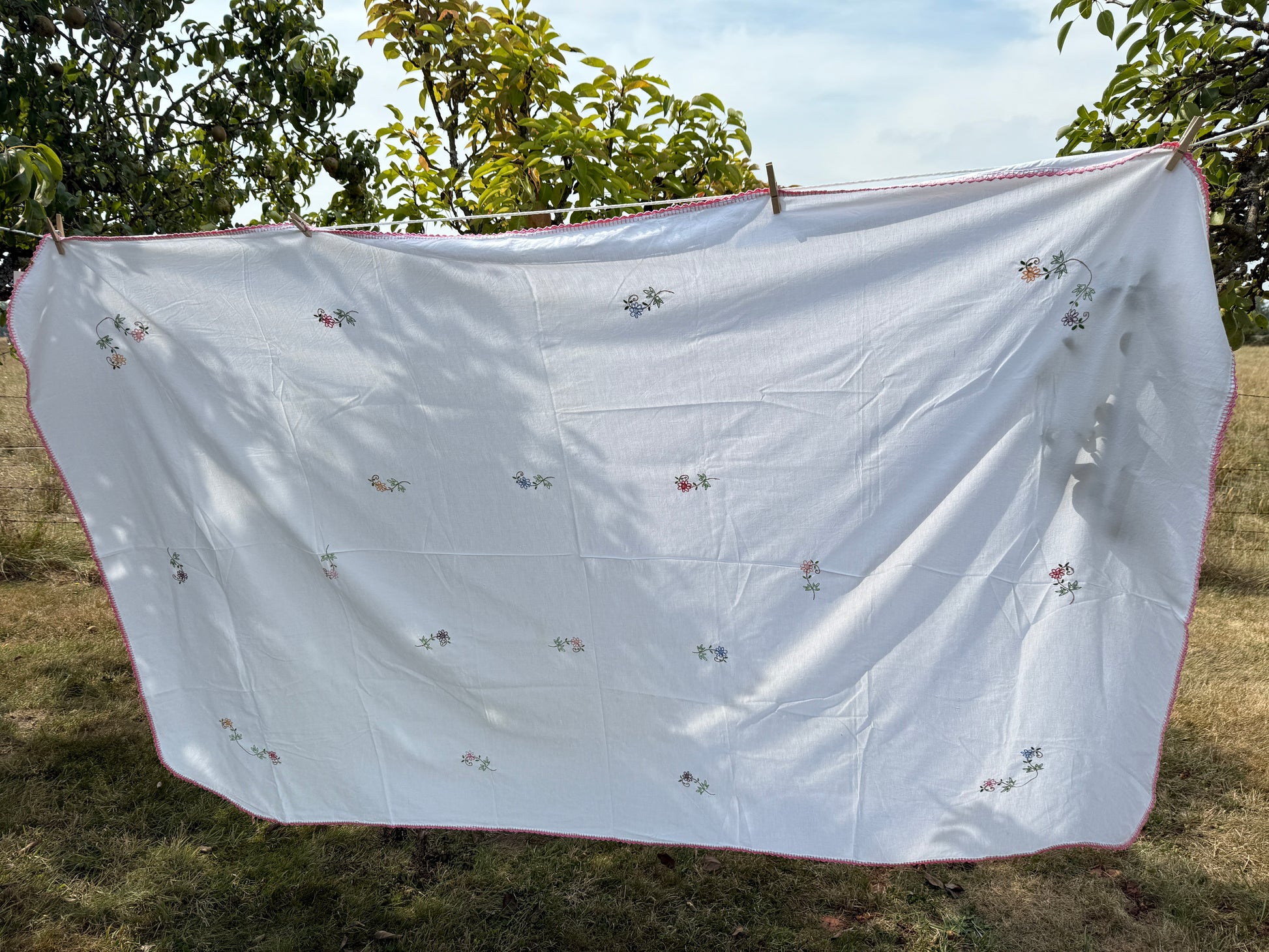 Colorful daisy with pink crochet edging 60" x 90" . Three coffee stains that can be worked around.