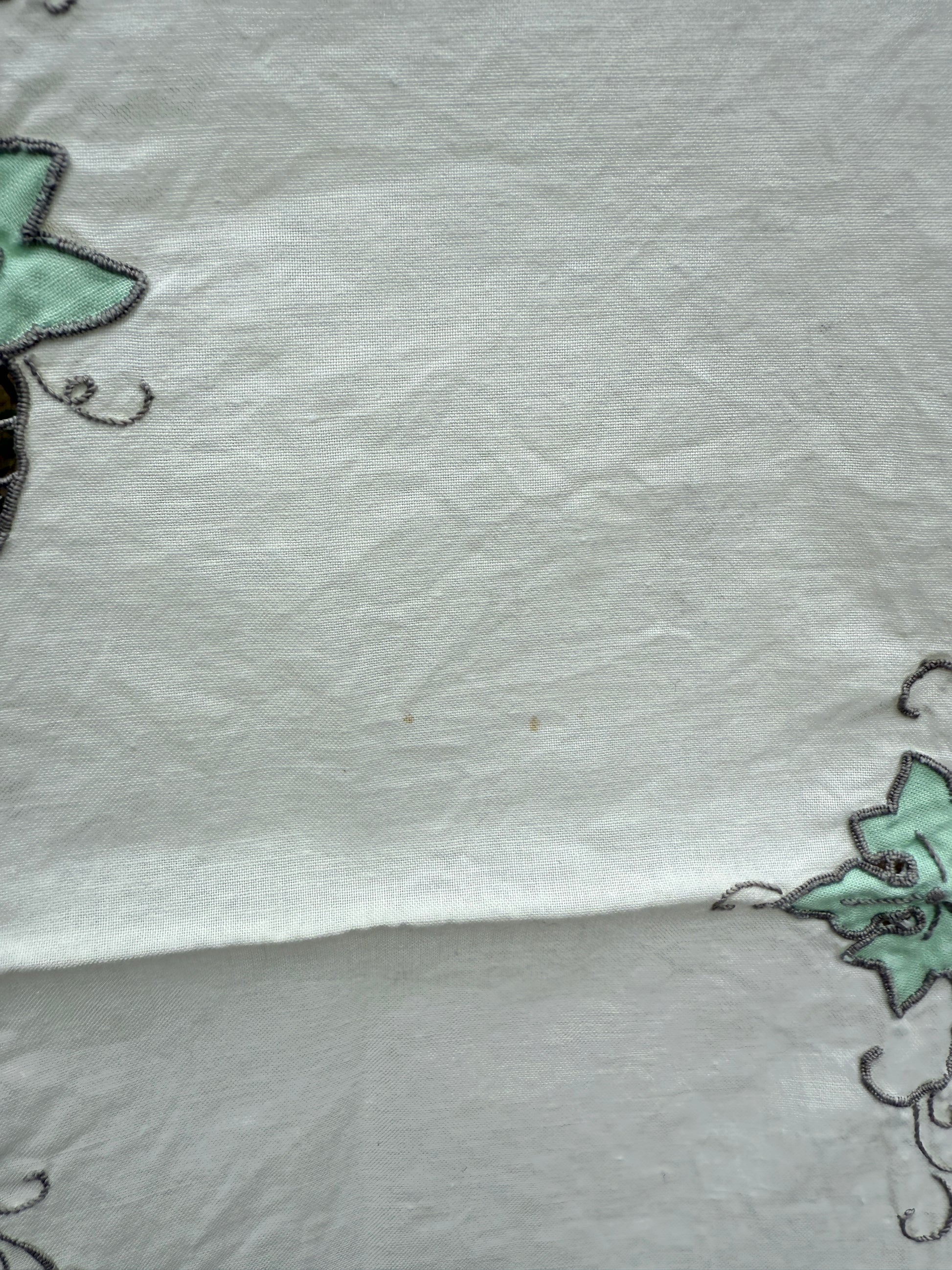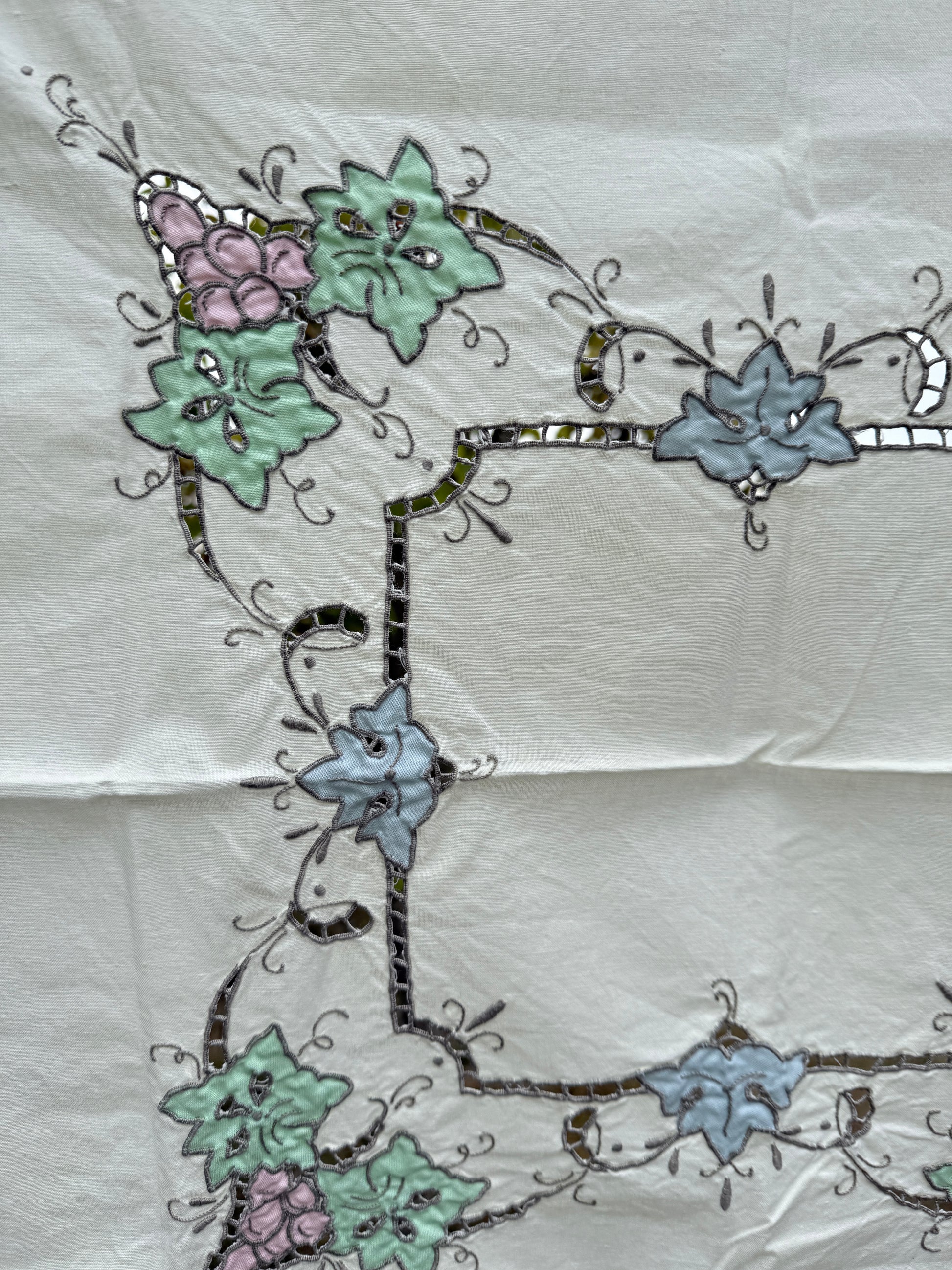 Pretty soft pastels appliqued on off white cotton in a 31" square. Two small stains (in last photo) could be embroidered over to cover. Would make a sweet vest or even a tote bag or beauty bags.