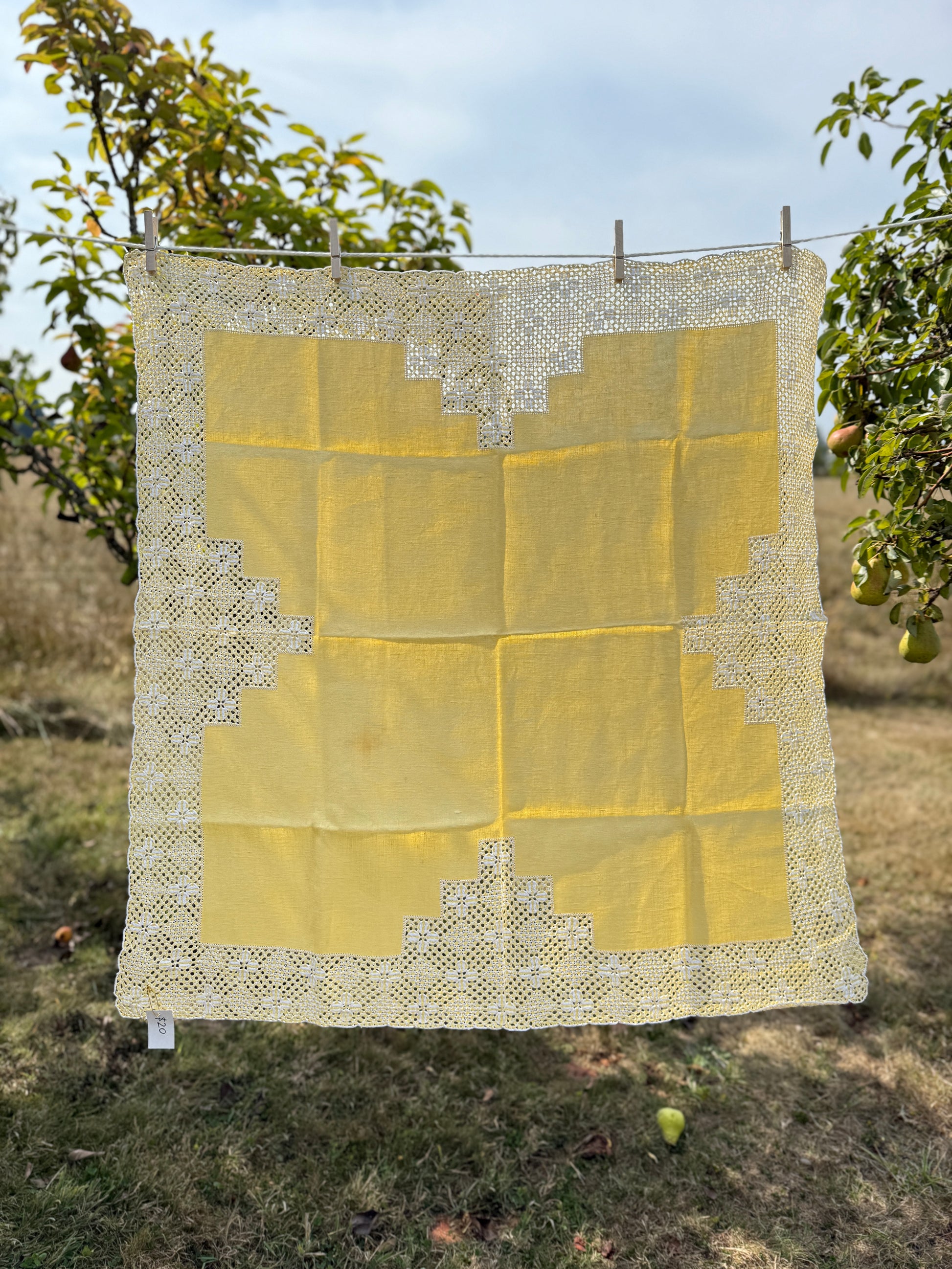 Soft canary yellow linen with white threadwork. 34" x 35" One coffee stain that would need to be worked around.