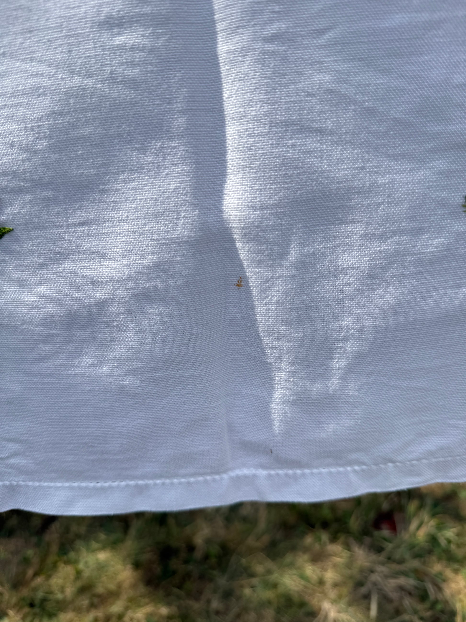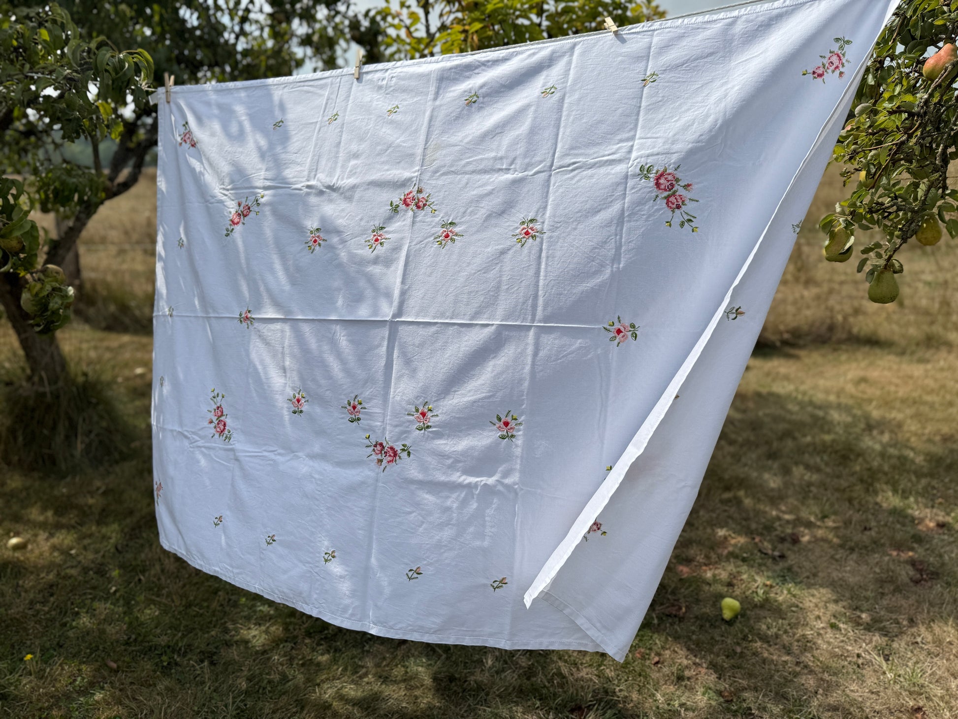 pink cross stitch roses and rose buds 46" x 66" on a heavier weight (almost feels like a canvas) textile. One coffee stain and one small stain to cut around.