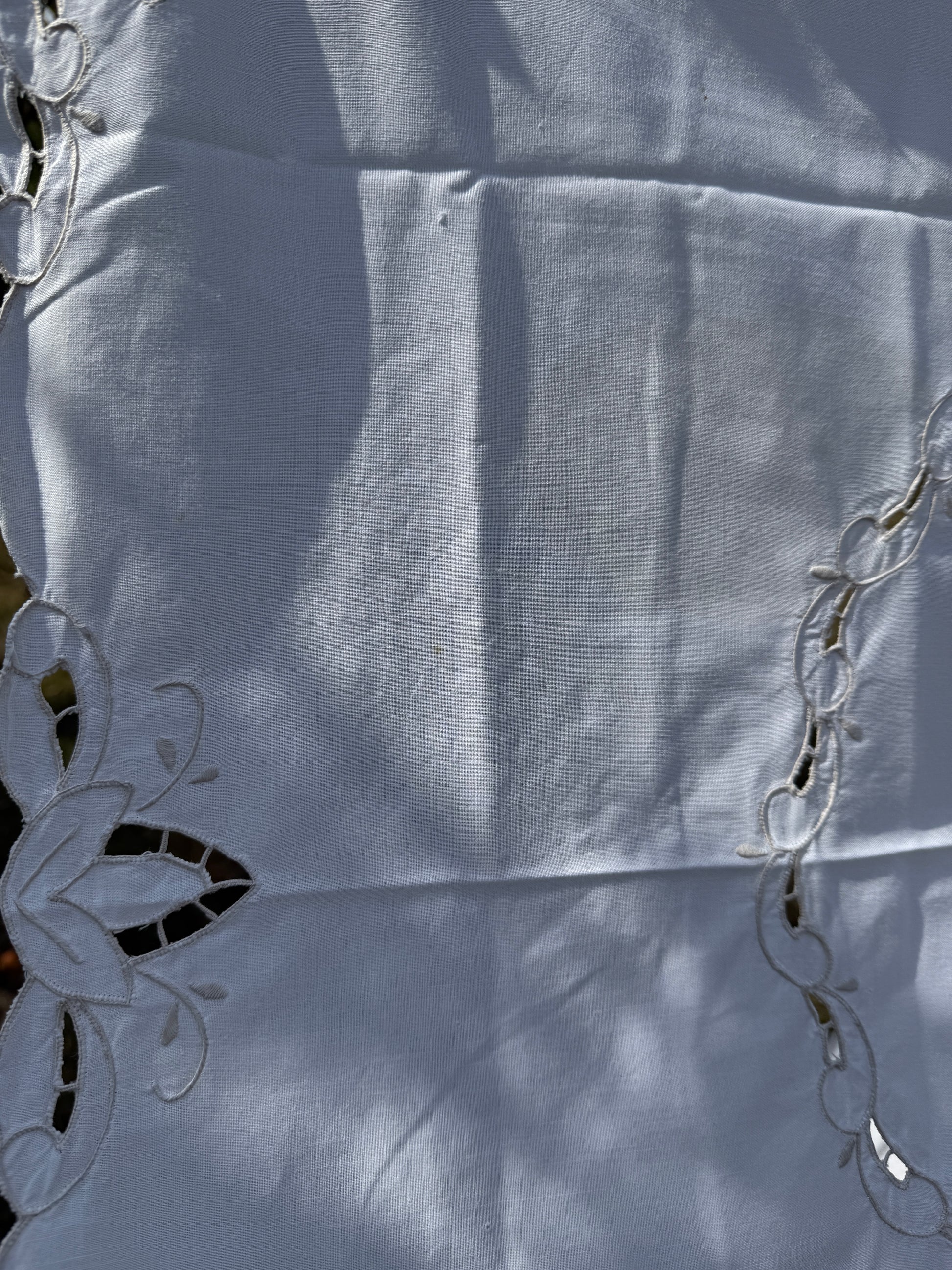 White with grey embroidery 31" x 33" has 4 tiny stains that could be embroidered over or worked around.