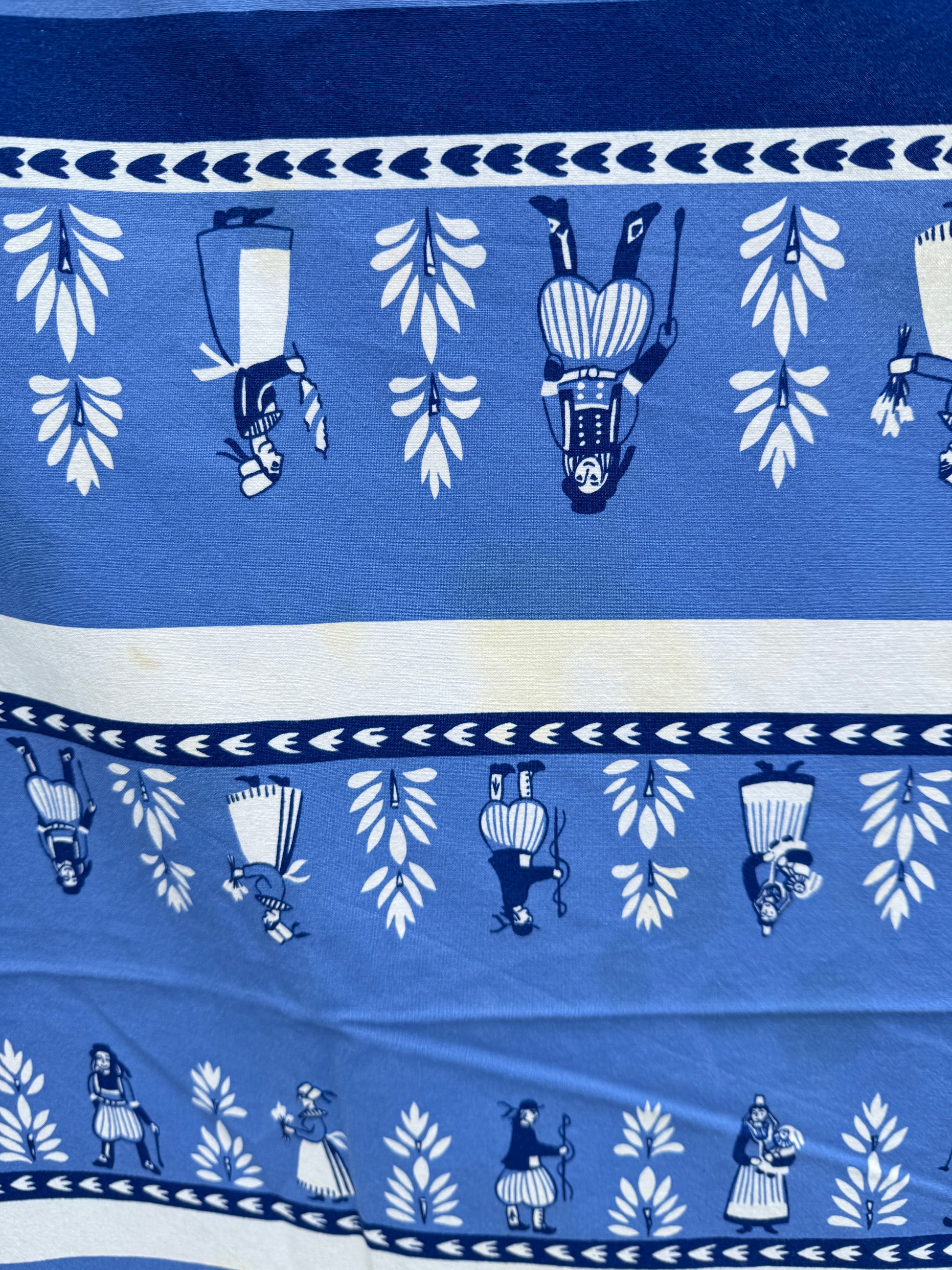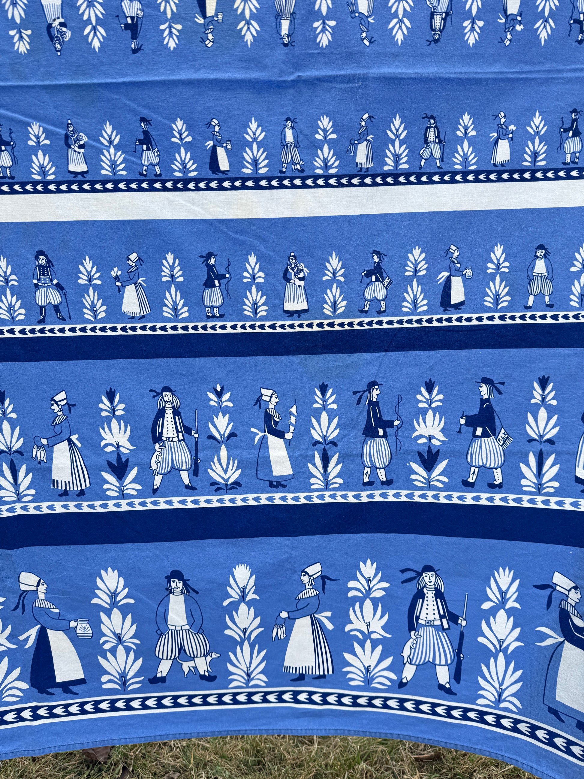 Unique French blue textile with people on it going in two directions. Tag says Made in France. Has a few coffee stains noticeable in the white stripe area but easy to work around. Fabric is a nice softly worn broadcloth or poplin. Would be adorable shorts, a jacket or skirt!