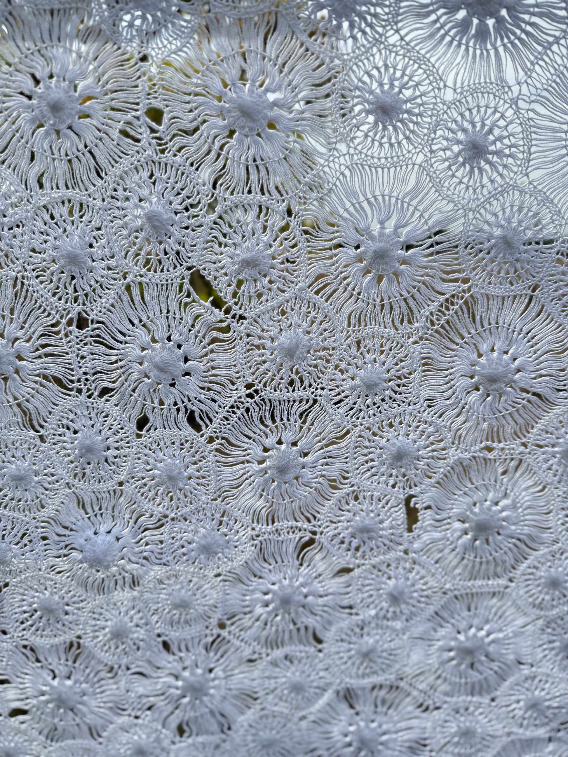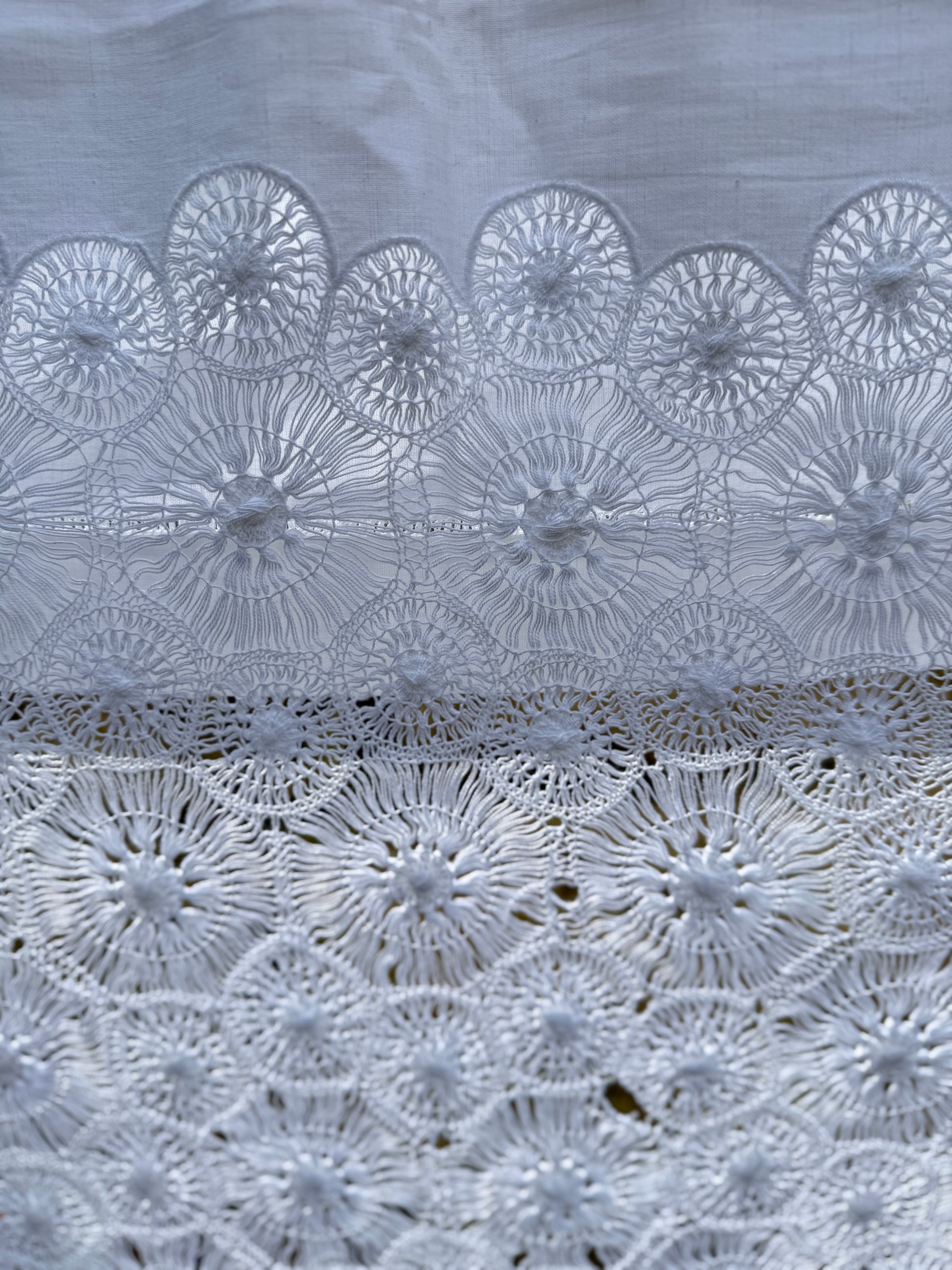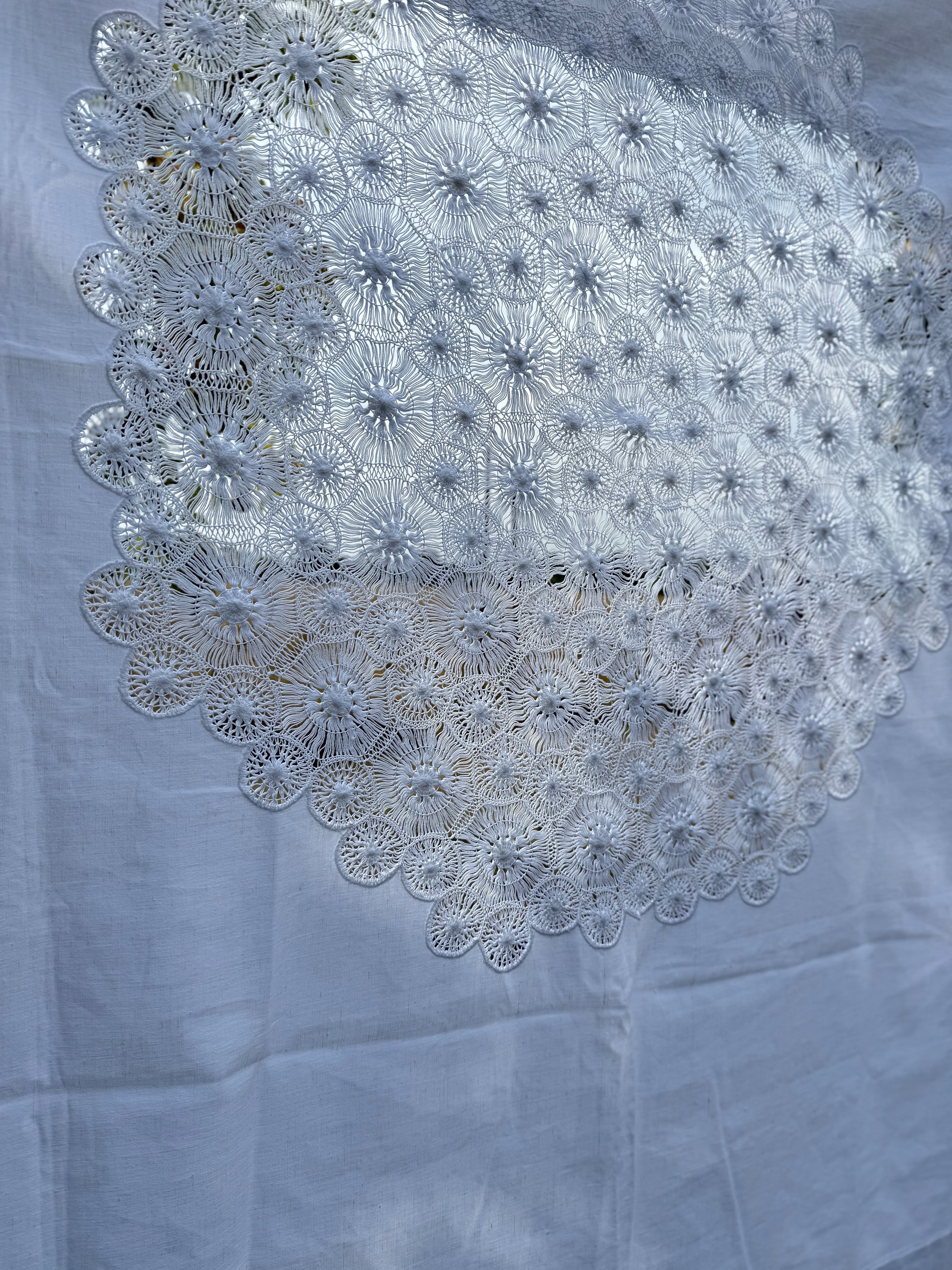 Really unique white linen with circles of various sizes inset into the middle and entredeaux edging. No stains but a few circles need to be reconnected. Linen size 60" x 63", diameter of circle inset is approx 29"