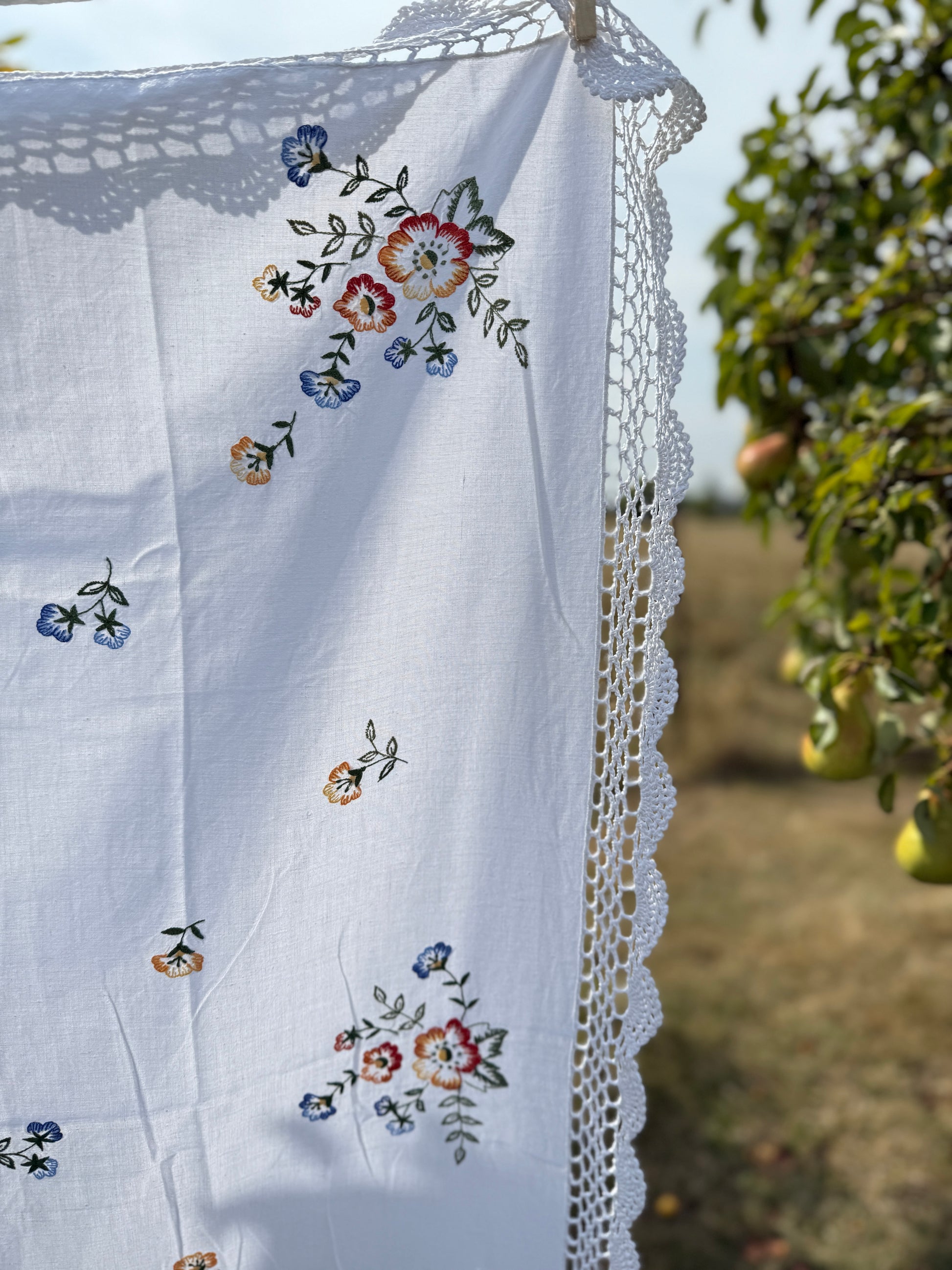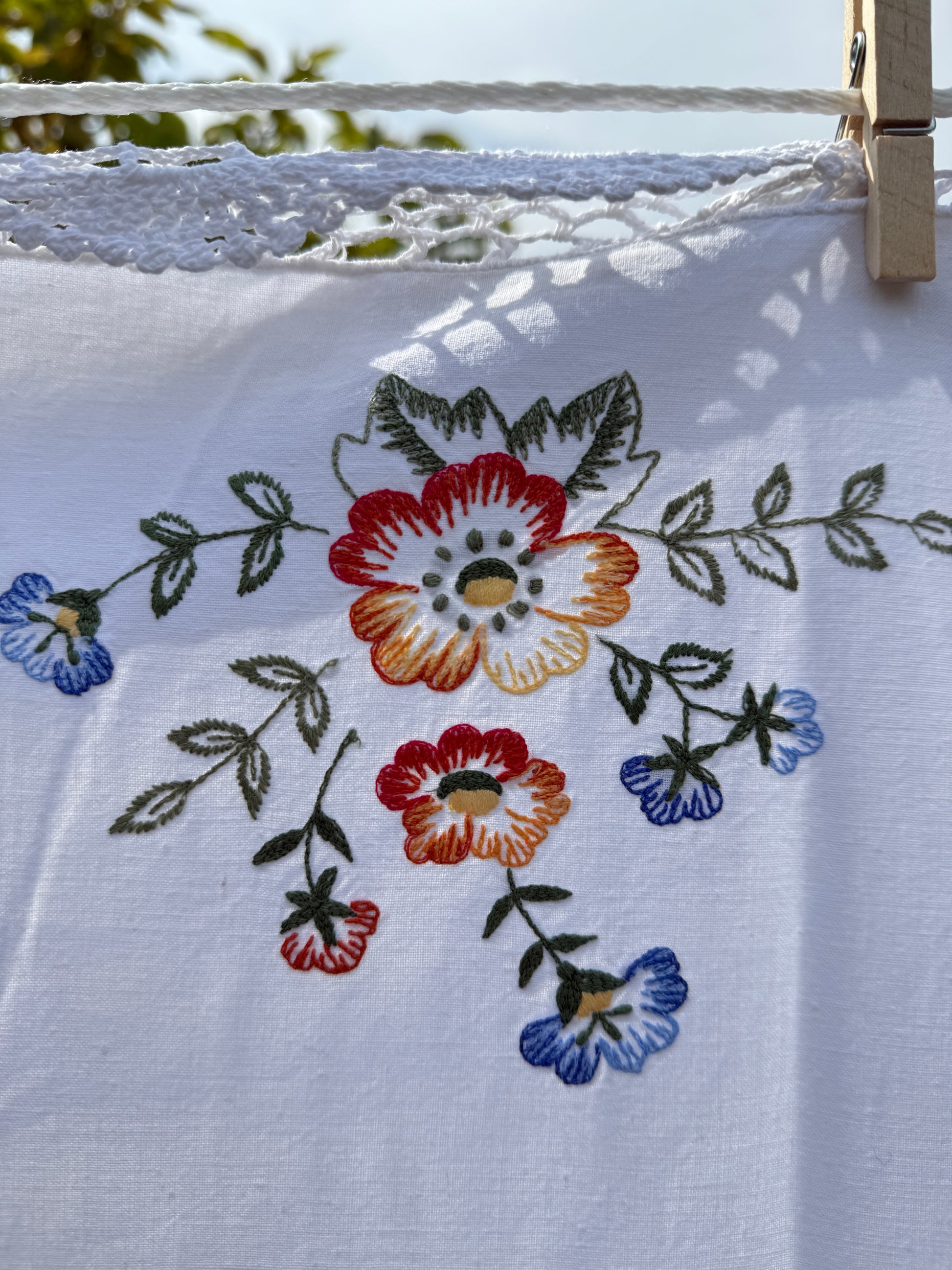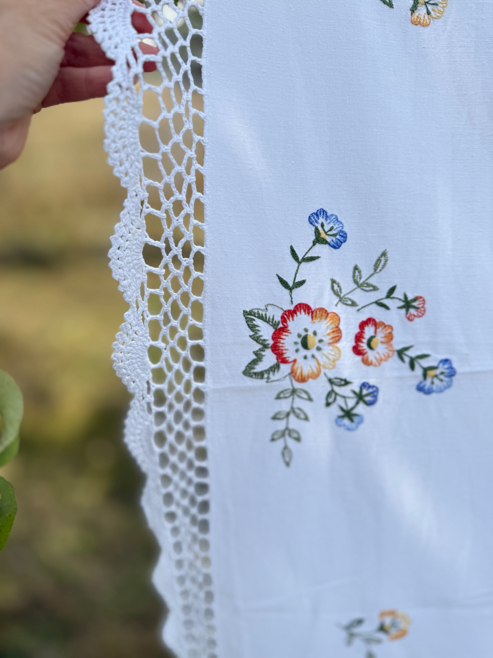 Pretty flowers in red, blue, and yellow with green stems and crochet edging 60" x 46" No visible stains.