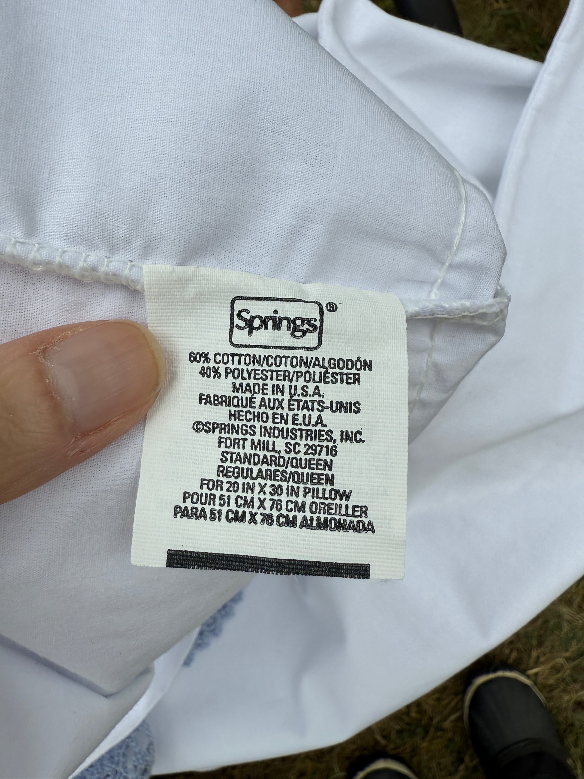 Set of 2 queen sized white 60% cotton/40% poly pillowcases with blue crochet trim along the entire edge. Never used.