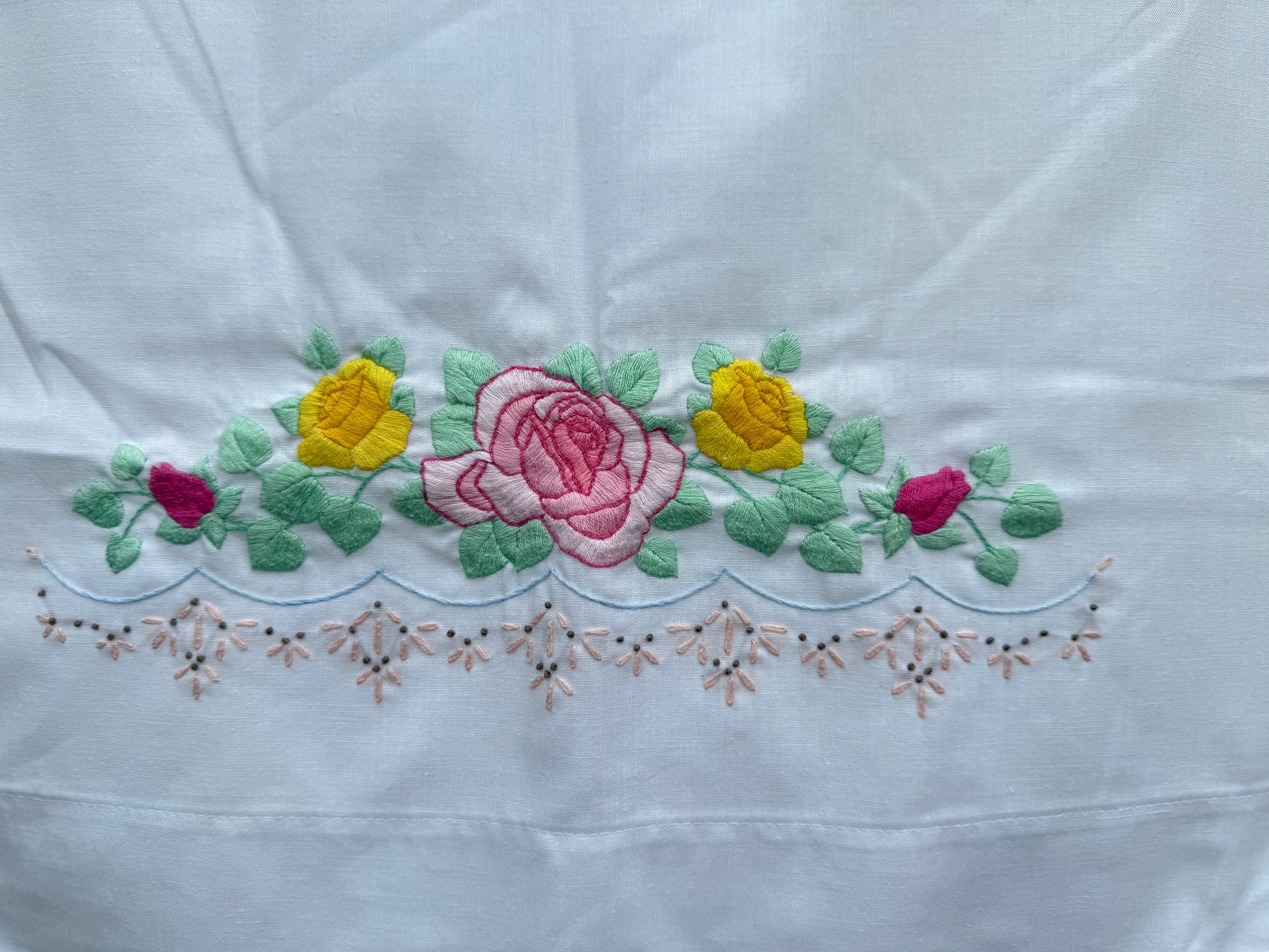 White poly/cotton blend pillowcase with pinks and yellows in embroidery.