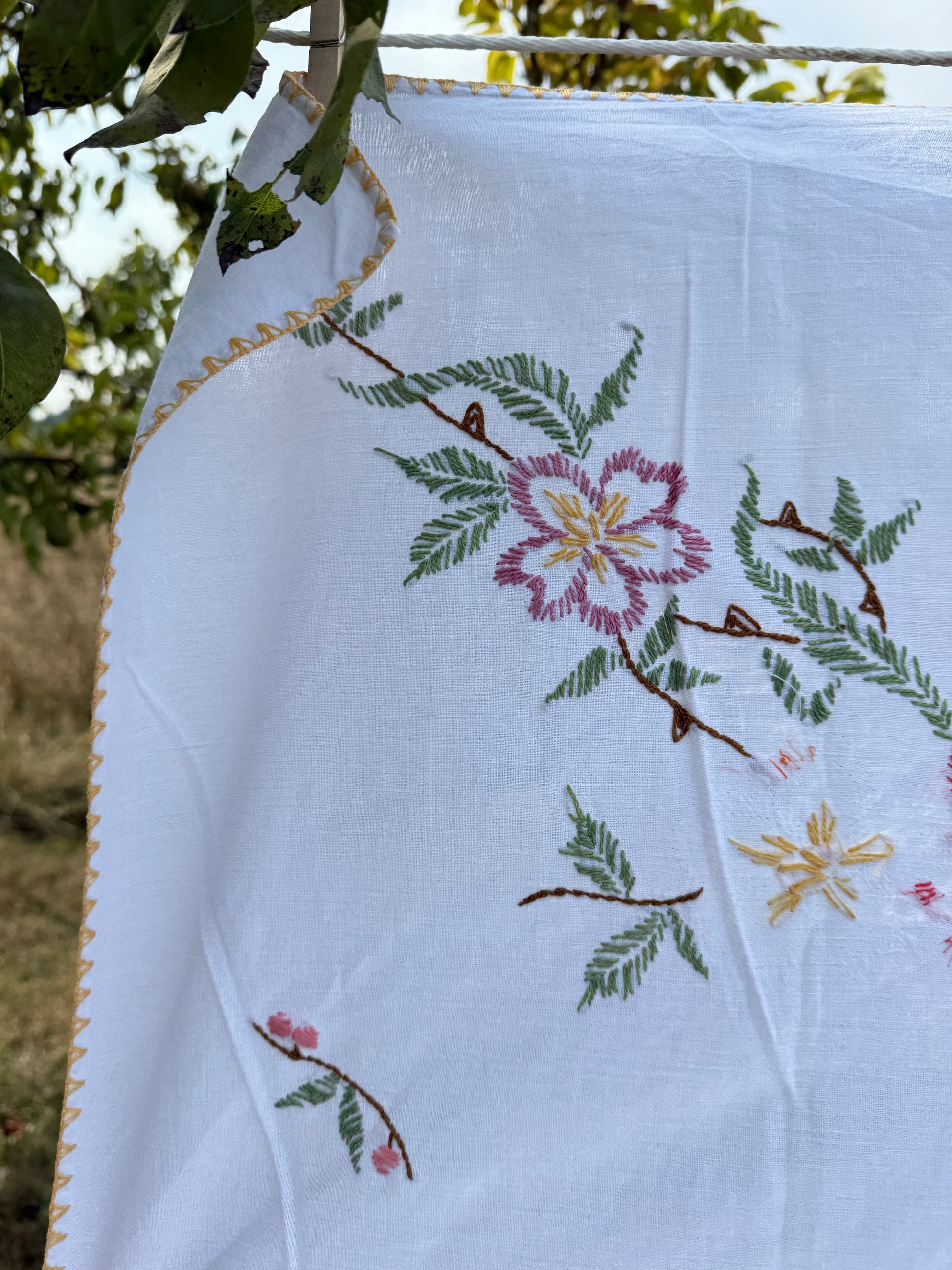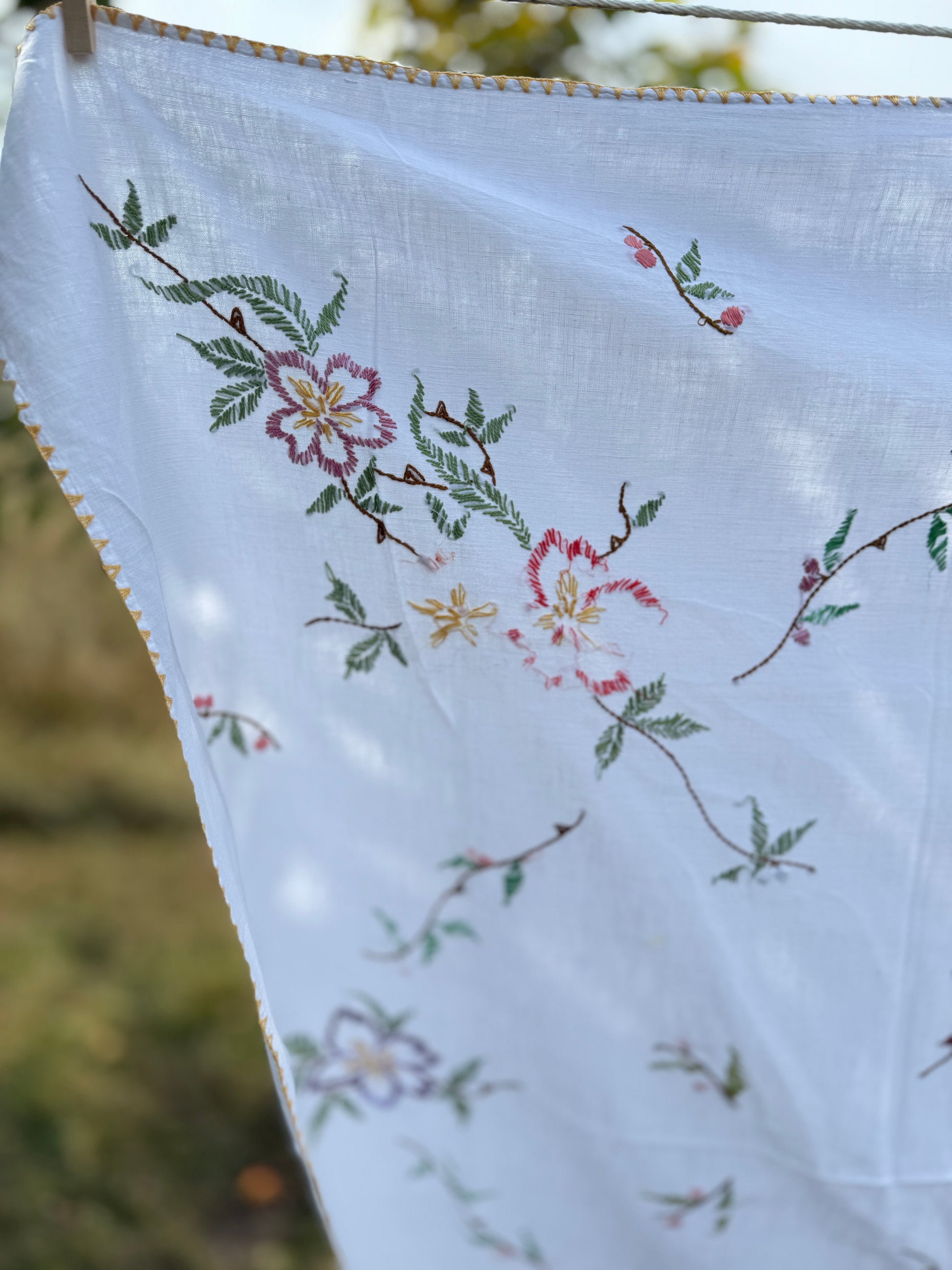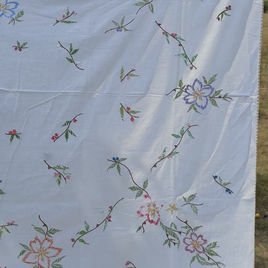 Multi colored flowers on soft worn in cotton with yellow blanket stitch crochet along the edges 58" x 44" A few flowers have threads coming loose, could be restitched or kept as part of the worn in well-loved look. Two very small stains.