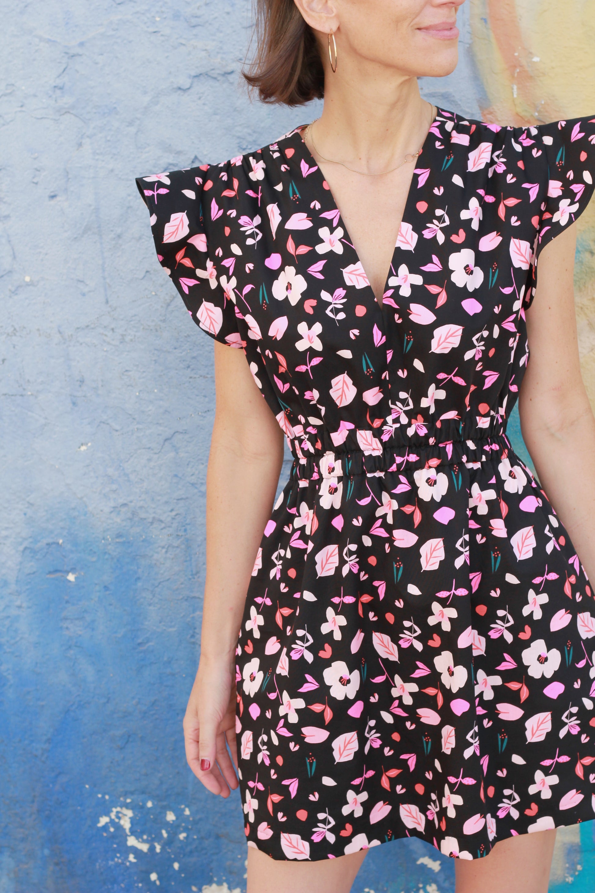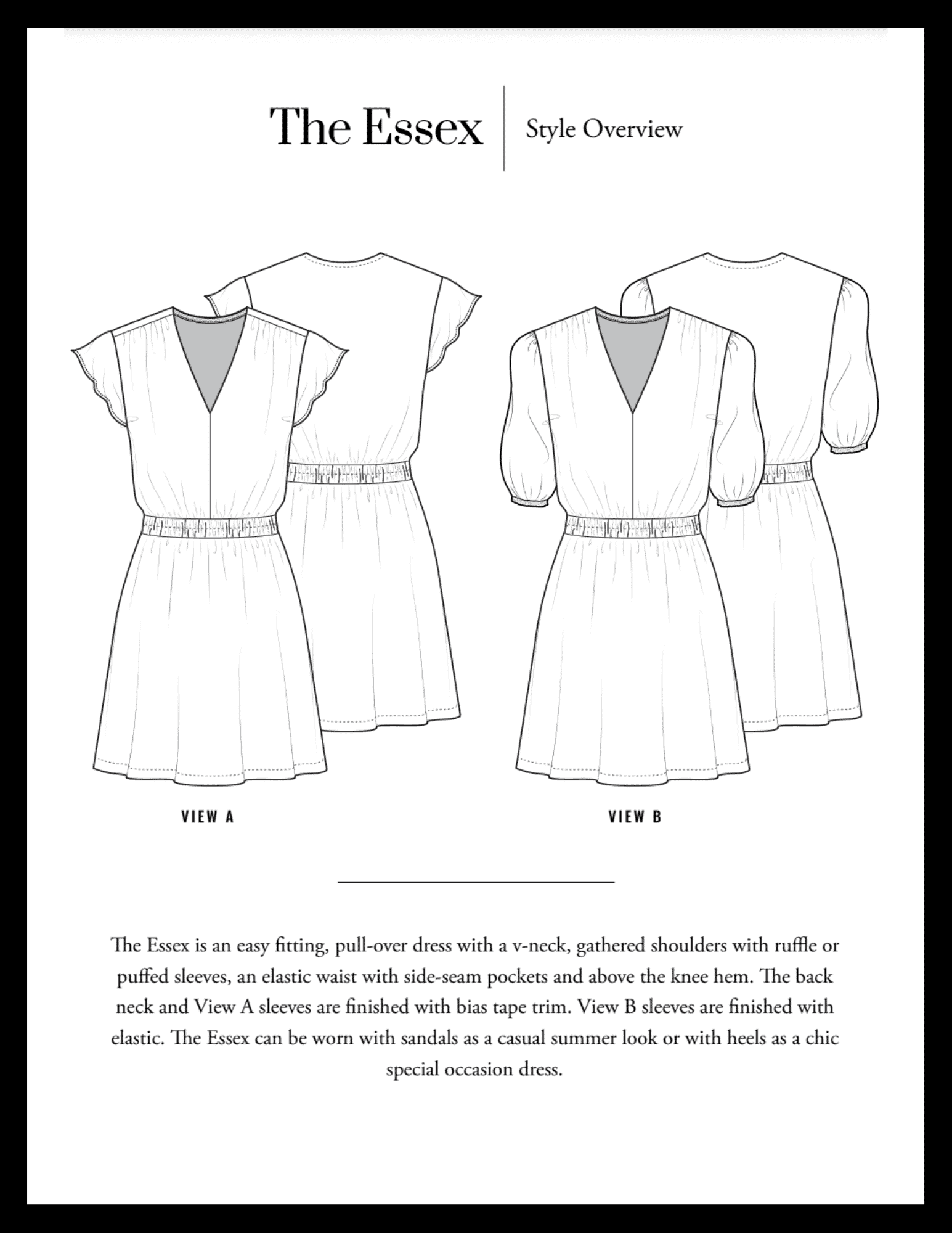 The Essex is an easy fitting, pull-over dress with a v-neck, gathered shoulders with ruffle or puffed sleeves, an elastic waist with side-seam pockets and above the knee hem. The back neck and View A sleeves are finished with bias tape trim. View B sleeves are finished with elastic. The Essex can be worn with sandals as a casual summer look or with heels as a chic special occasion dress.