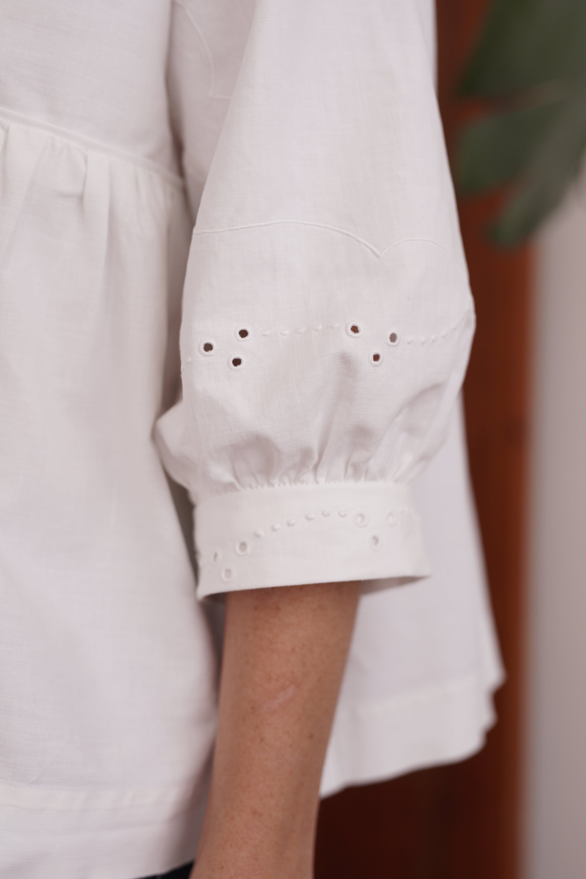 The Minetta Dress & Top is a loose fitting, pullover dress and top with bustier detailing on the front yoke, mid length sleeves gathered into a cuff, button or grosgrain ribbon back closure, side seam pockets and a ruffled bottom hem.