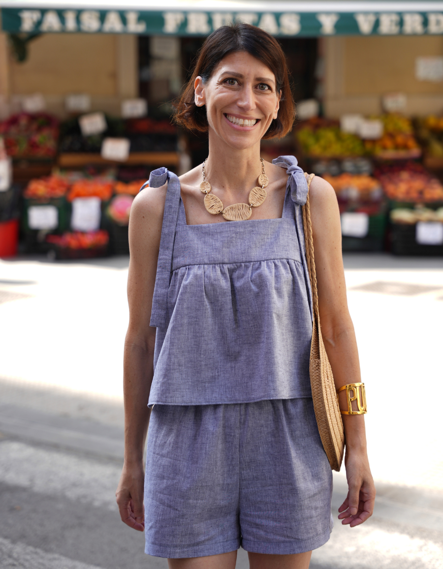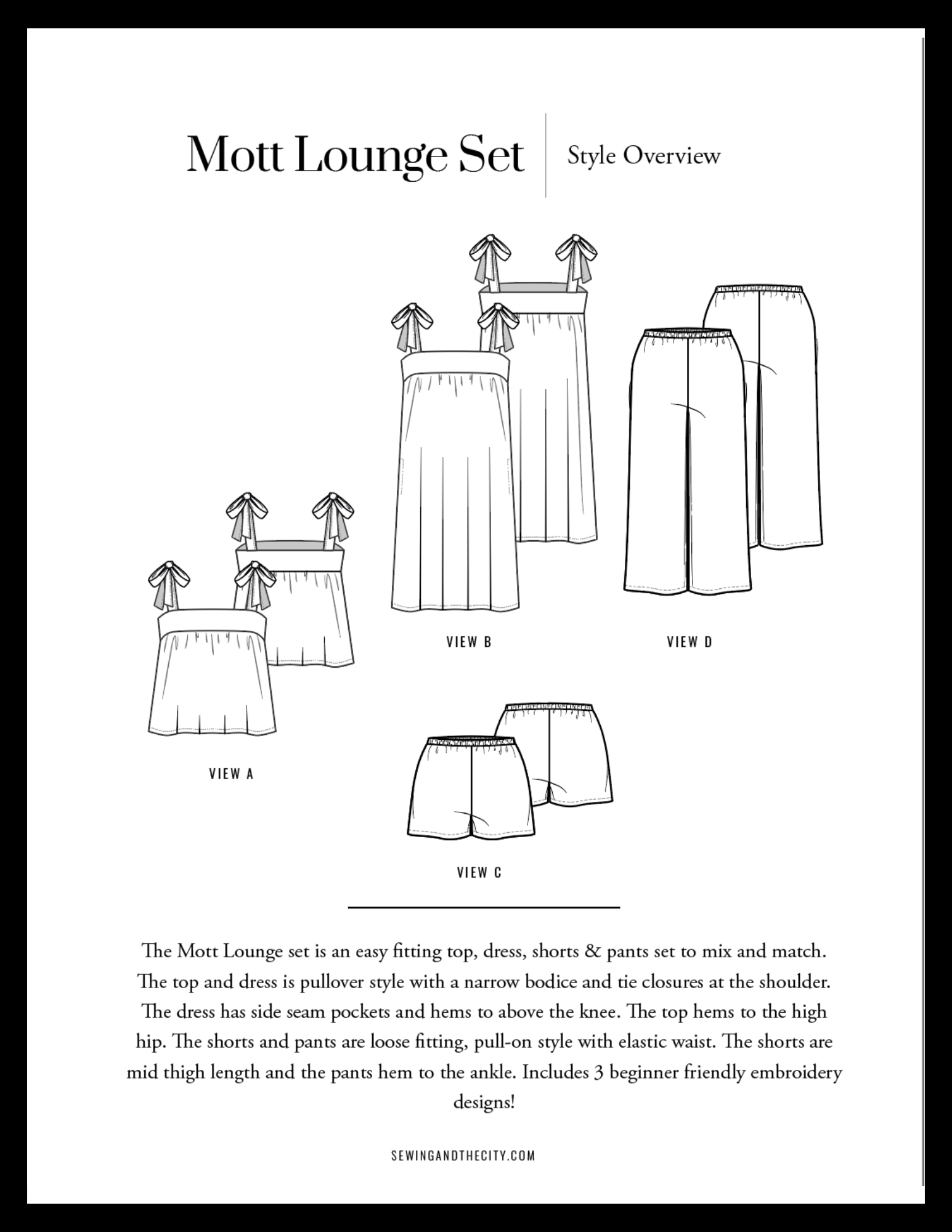 The Mott Lounge set is an easy fitting top, dress, shorts & pants set to mix and match. The top and dress is pullover style with a narrow bodice and tie closures at the shoulder. The dress has side seam pockets and hems to above the knee. The top hems to the high hip. The shorts and pants are loose fitting, pull-on style with elastic waist. The shorts are mid thigh length and the pants hem to the ankle. Includes 3 beginner friendly embroidery patterns!!