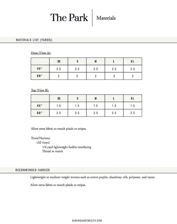 Lightweight to medium weight wovens such as cotton poplin, chambray, silk, polyester, and rayon. Allow extra fabric to match plaids or stripes.