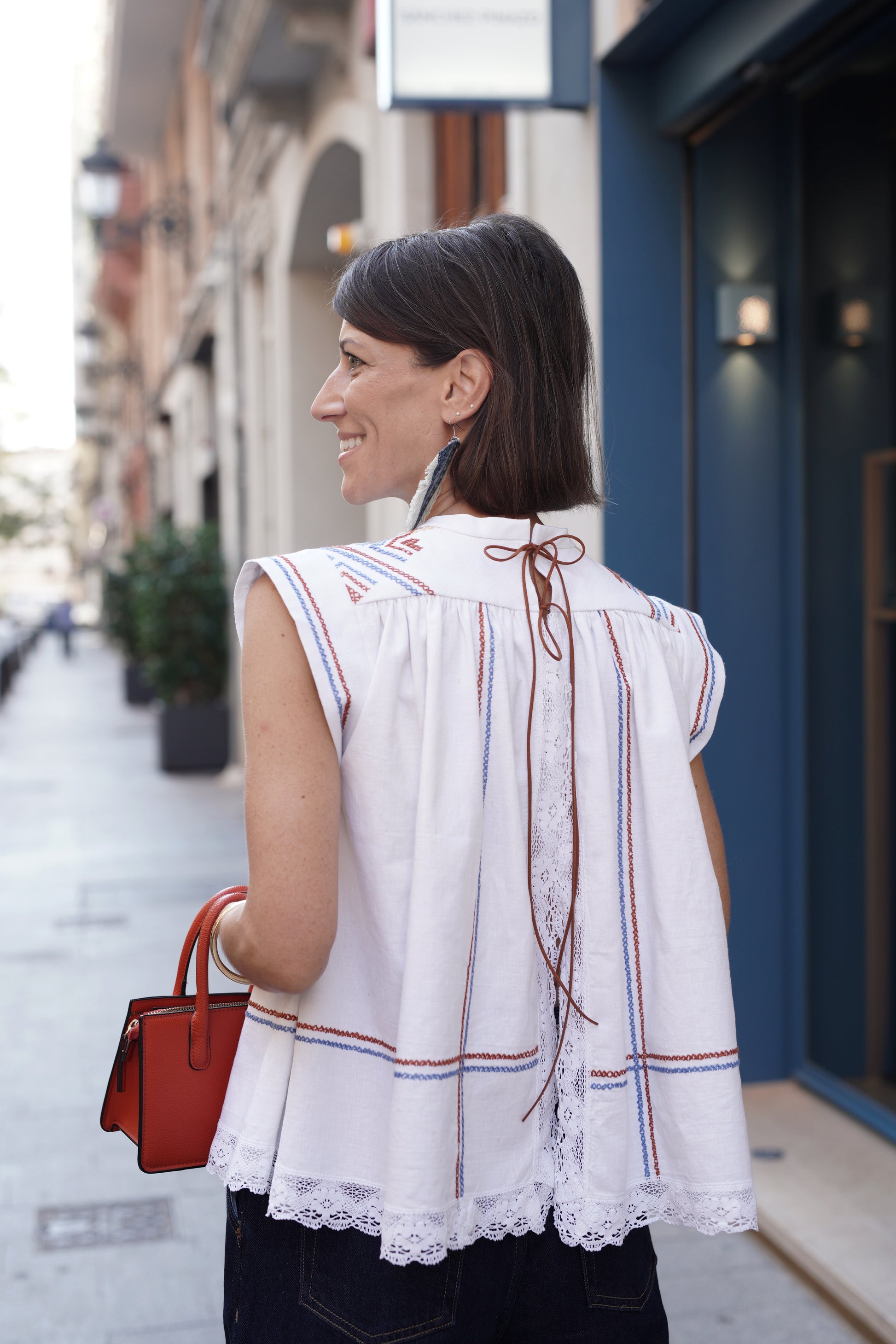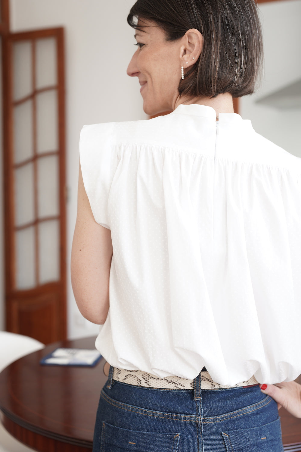 The Vandam is an easy fitting pullover dress and top featuring a full skirt with pockets gathered into a self lined yoke, bias neckband, arm flange, and a back zipper closure.